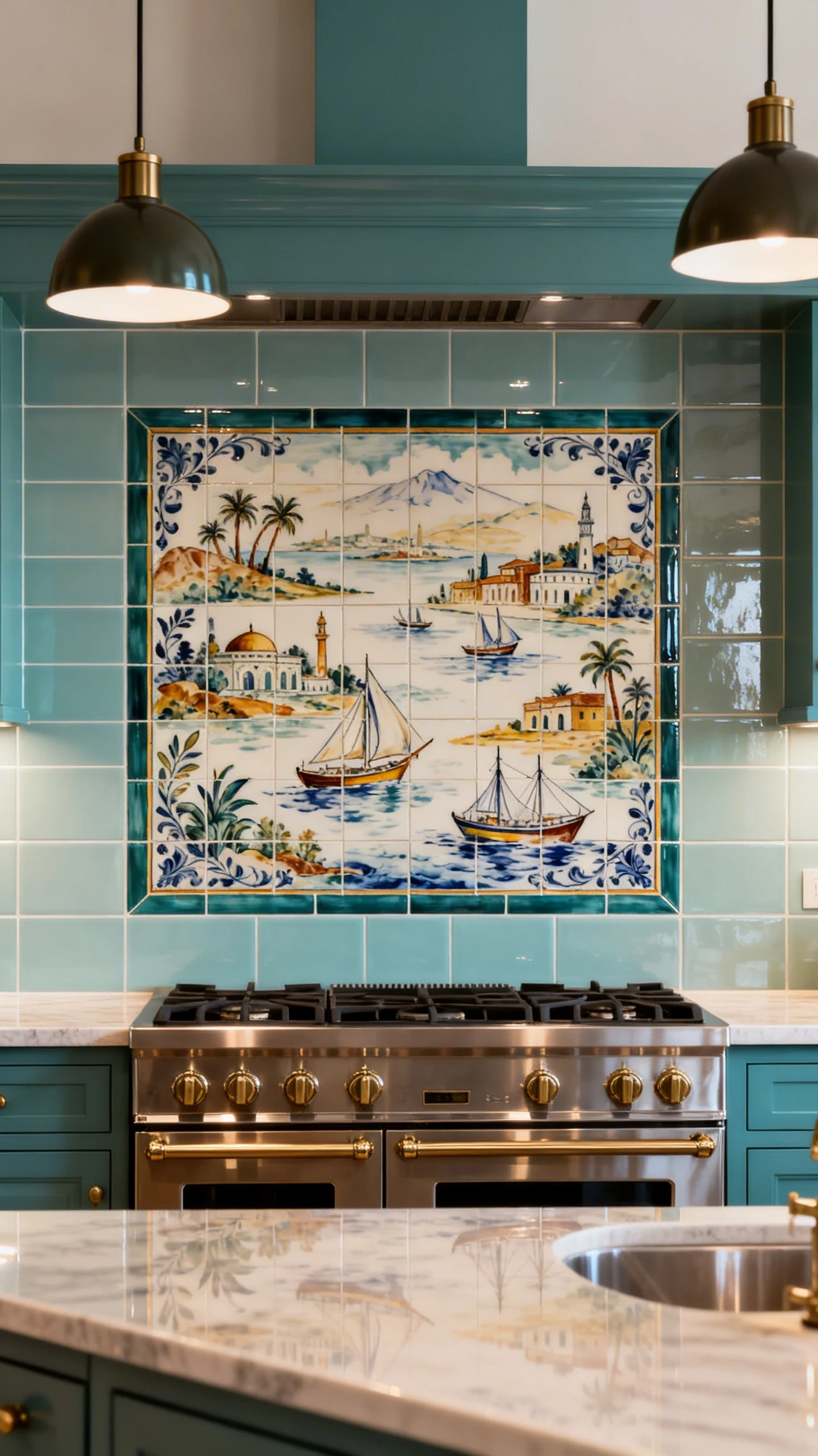 If you want a backsplash that feels truly one-of-a-kind, consider hand-painted tile or art tile accents. This is how you get that “I found this on a trip” vibe even if you ordered it from your couch.