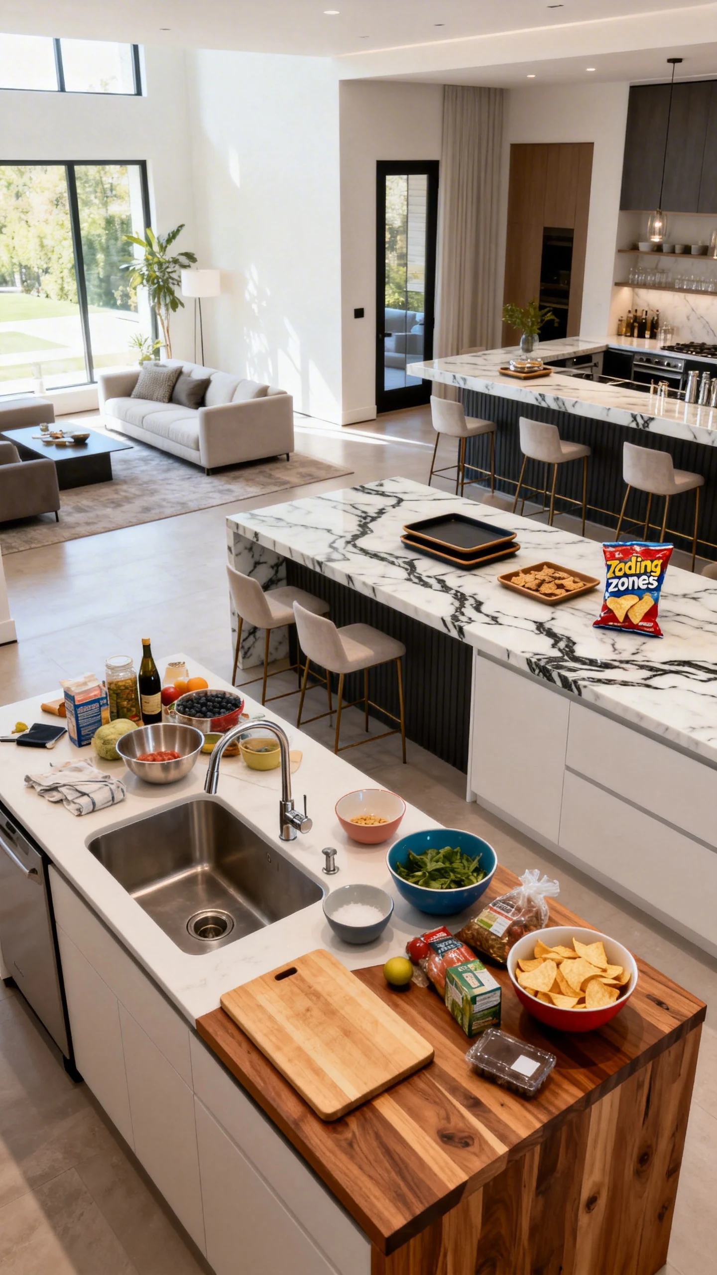 • Plan landing zones: space for groceries, space for serving trays, space for that one person who always brings a giant bag of chips.