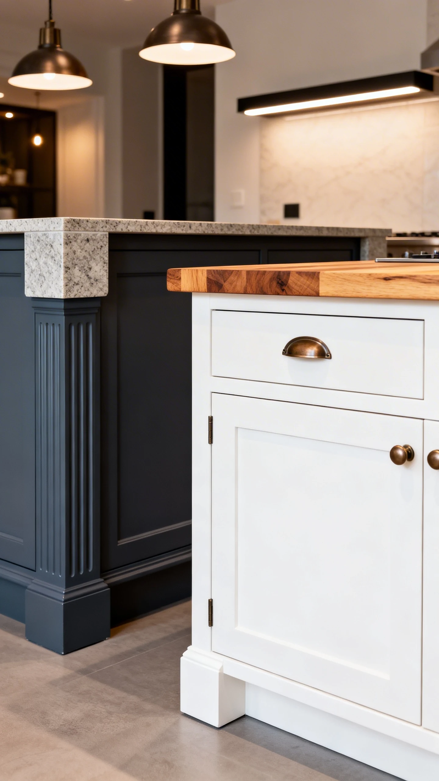 • Color contrast: one island in a moody paint color, one in warm white or natural oak.