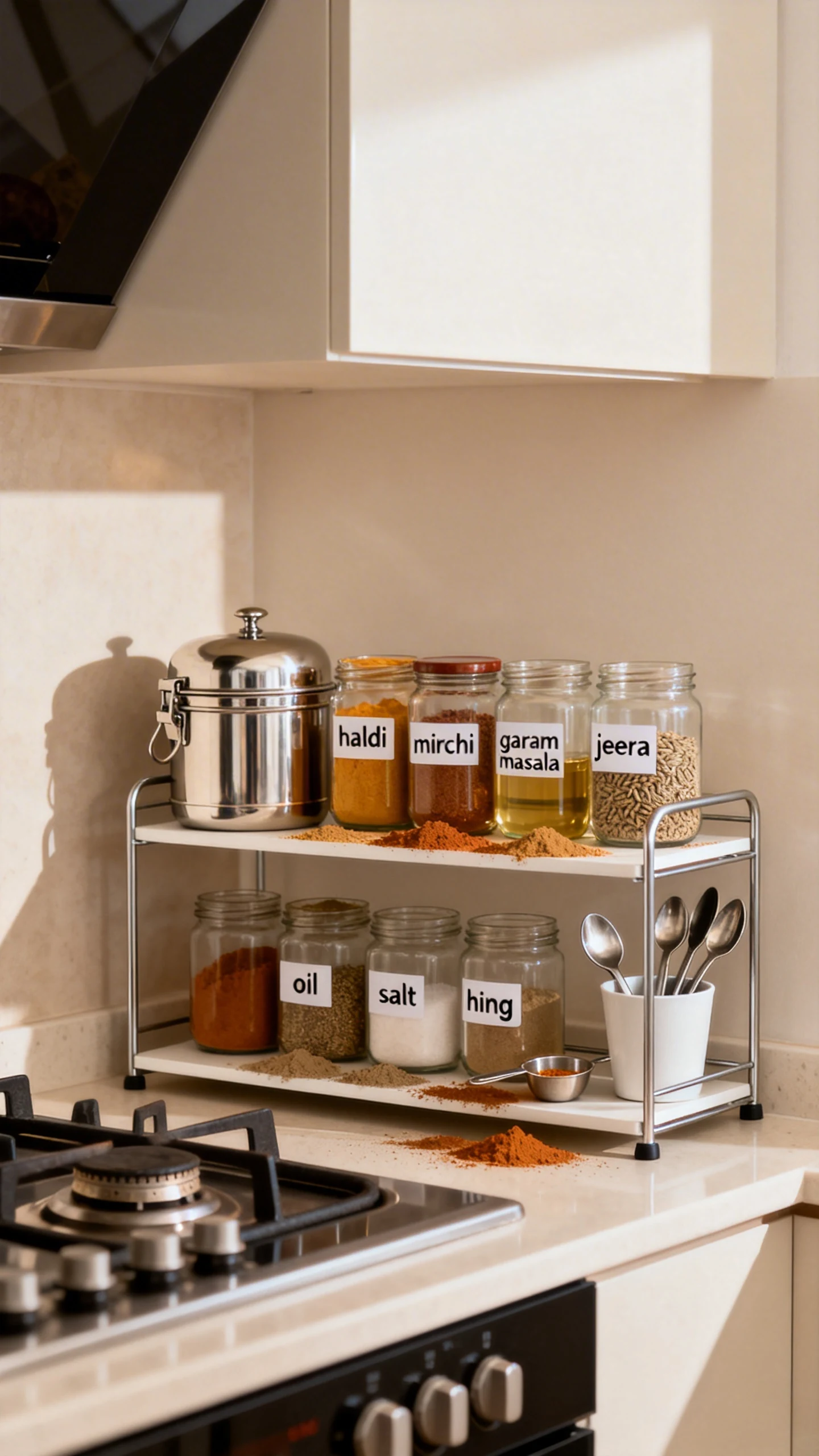 Use clear, matching jars if possible. They look neat, sure, but more importantly, you can see what is running low before you end up with two jars of chaat masala and zero coriander powder. Classic.