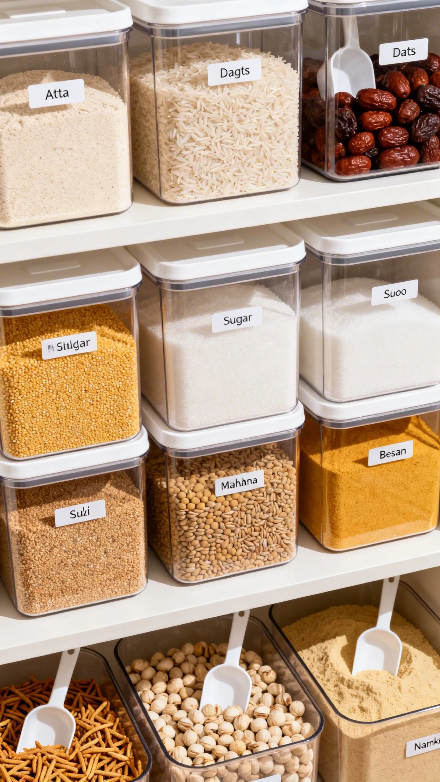 If you have ever opened a cabinet and been attacked by half-folded rice bags and floppy atta packets, this section is for you. Decanting dry goods is one of the simplest ways to make an Indian kitchen look organized and work better.