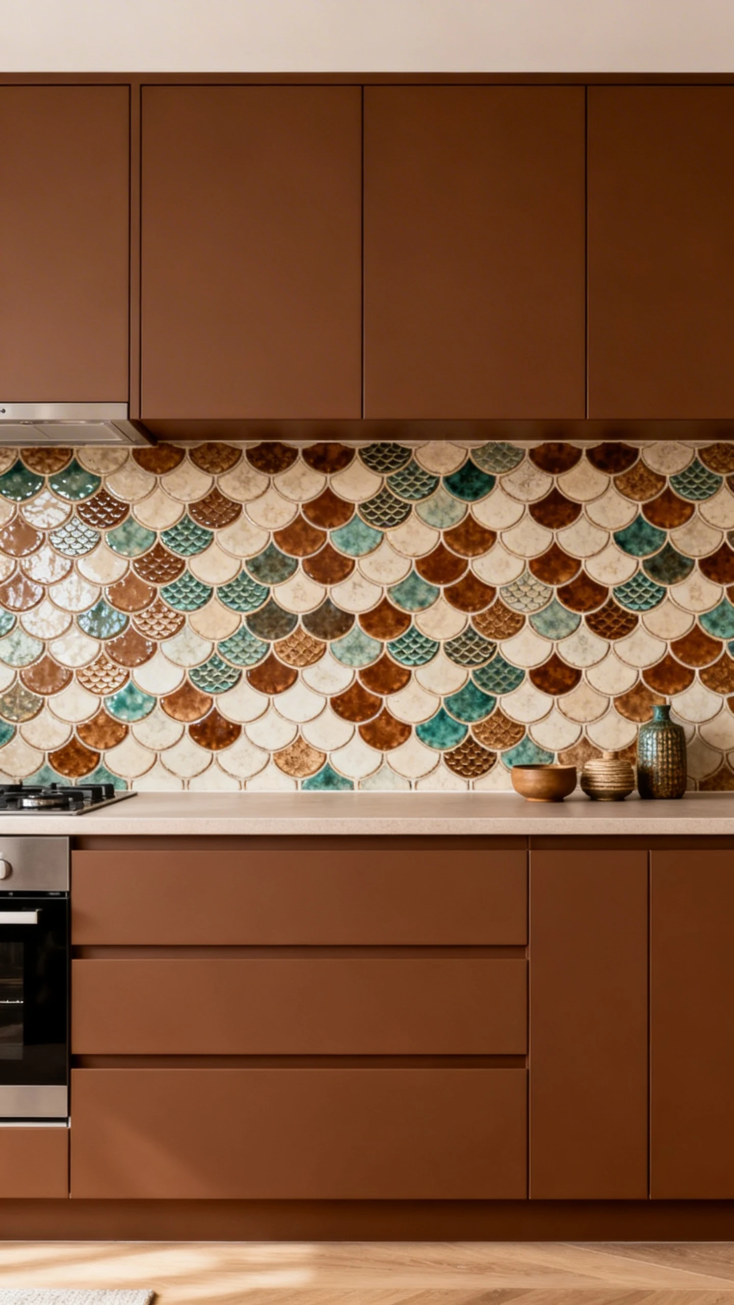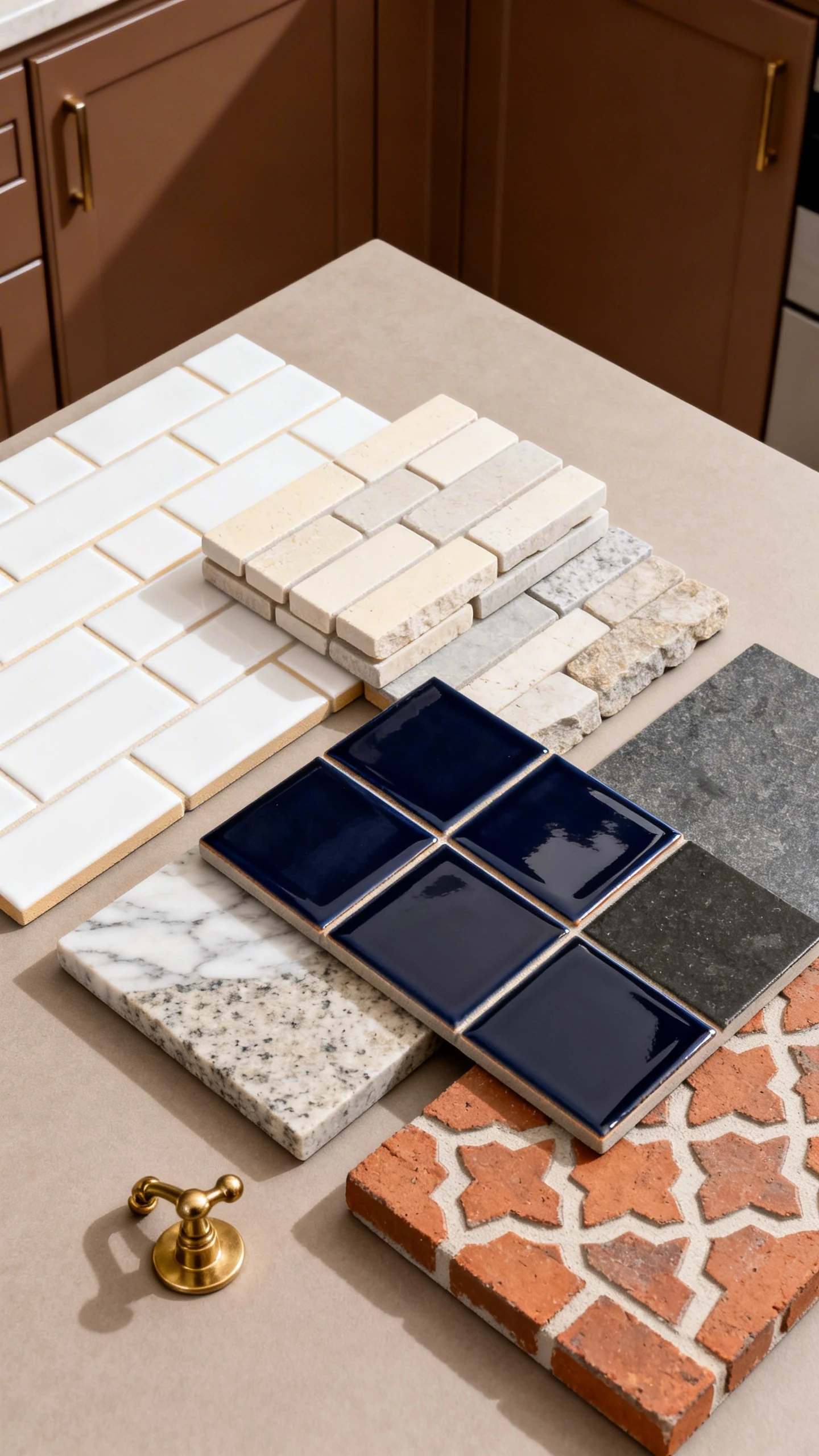 Brown cabinets can lean red, orange, or neutral. Your backsplash should match that energy, not fight it like a petty group chat.