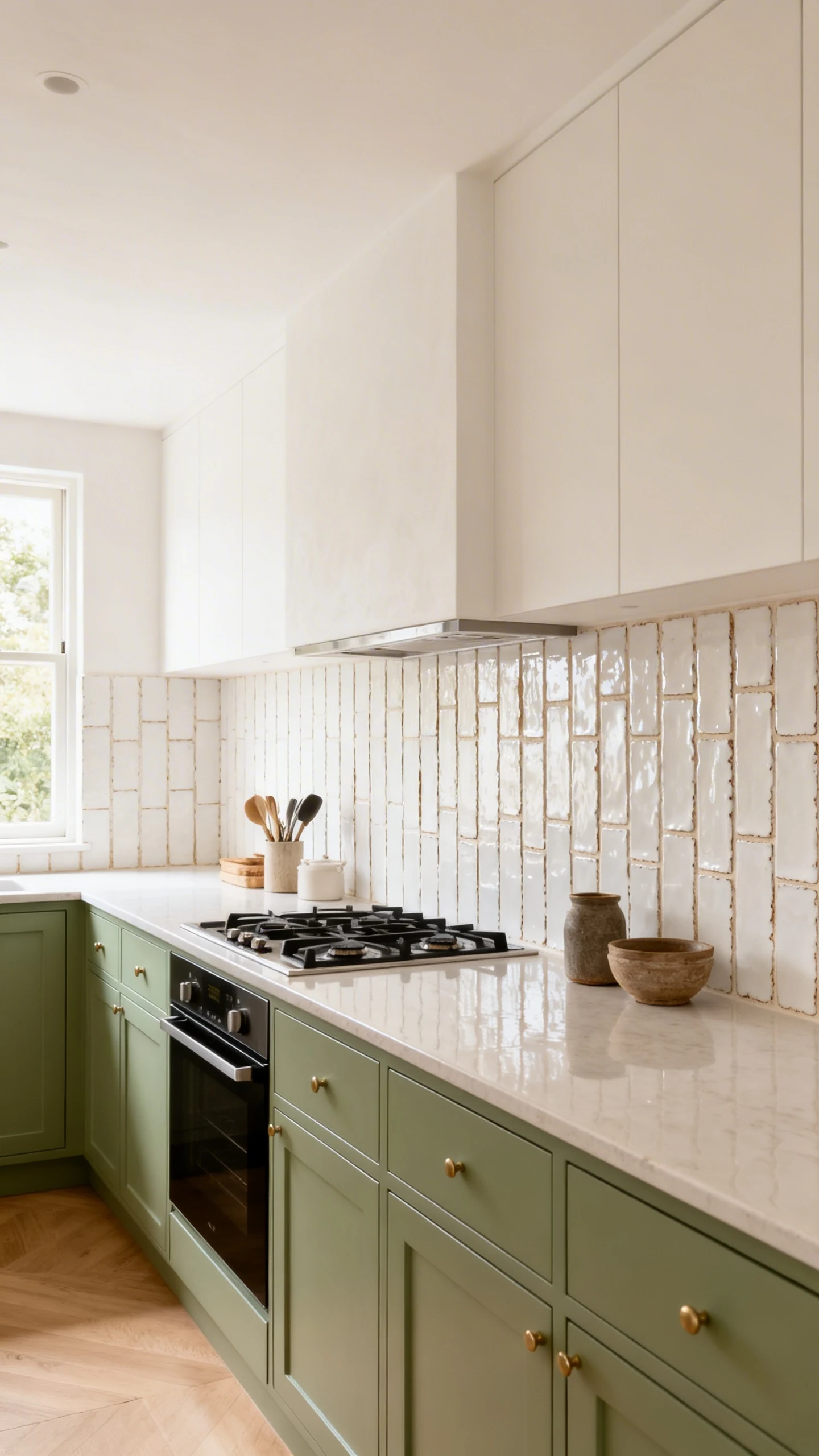 Sage green leans earthy and muted, so pairing it with a warm white keeps everything soft and cohesive. The tiny imperfections in zellige add texture, which is key when your cabinet color is already calm and tonal.