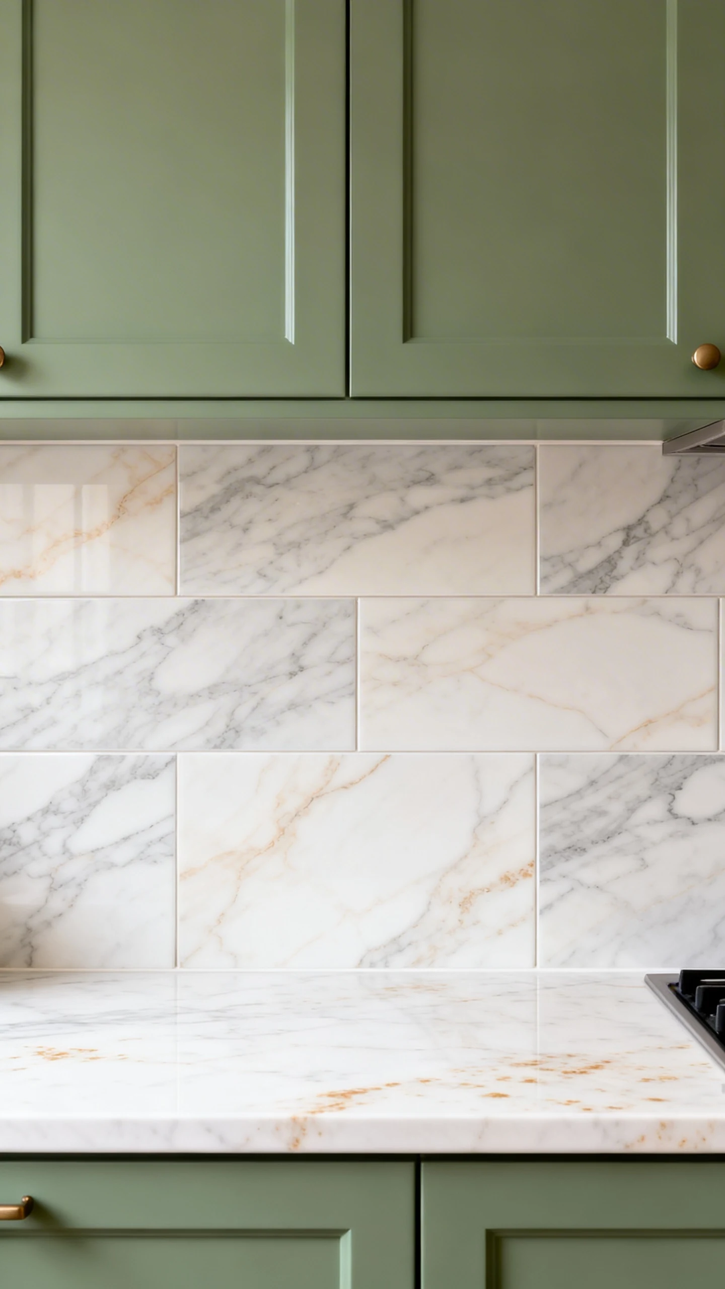 Want the backsplash to say “I have taste” instead of “I bought whatever was on sale”? Marble-look tile is your best friend. Especially with sage green cabinets, because the pairing feels fresh, timeless, and just fancy enough.
