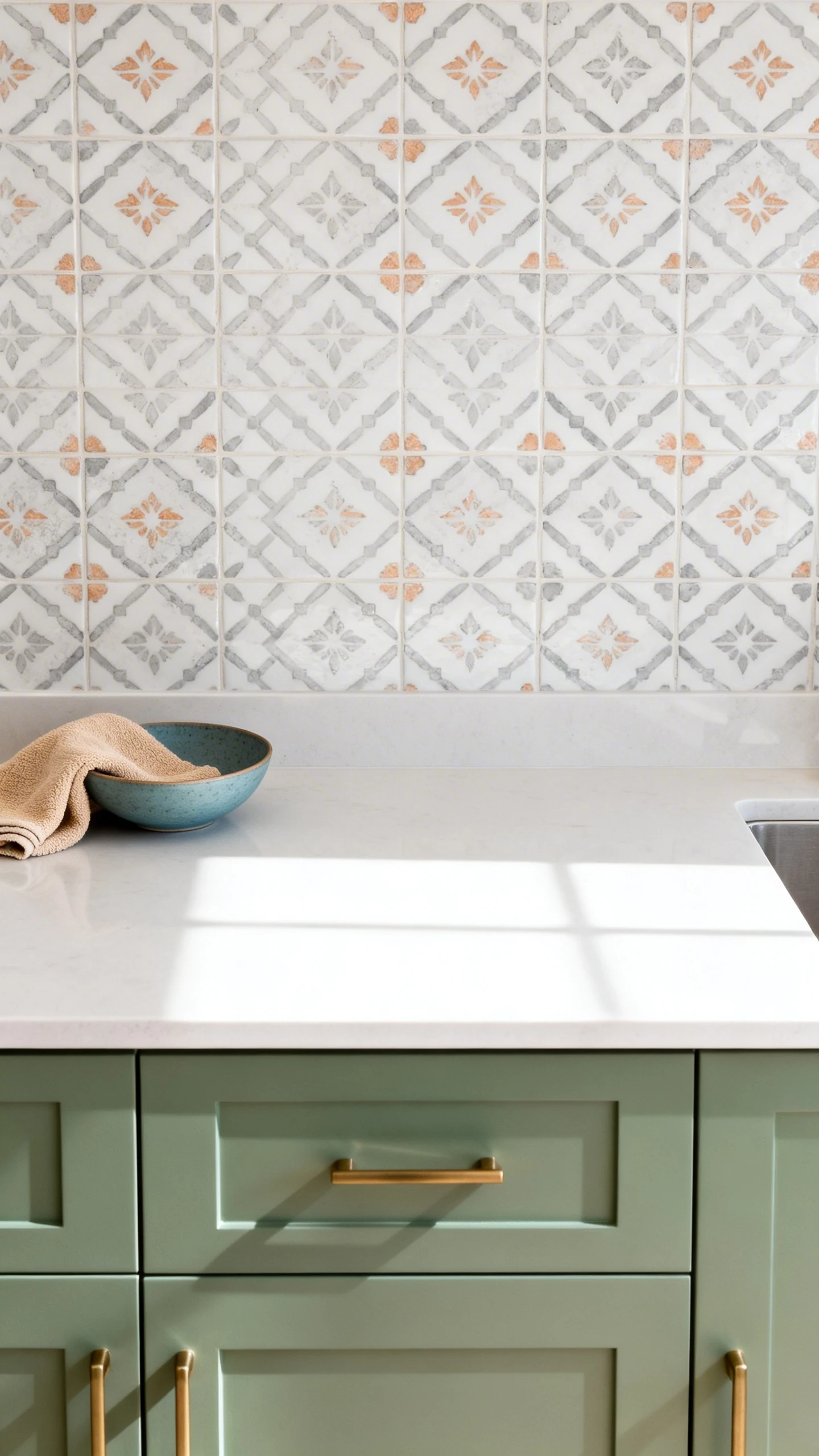 • Muted sage-adjacent patterns that tie into the cabinets without matching perfectly.