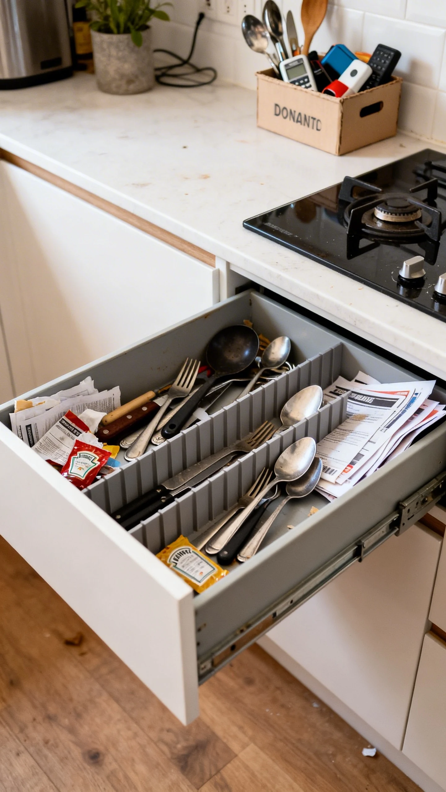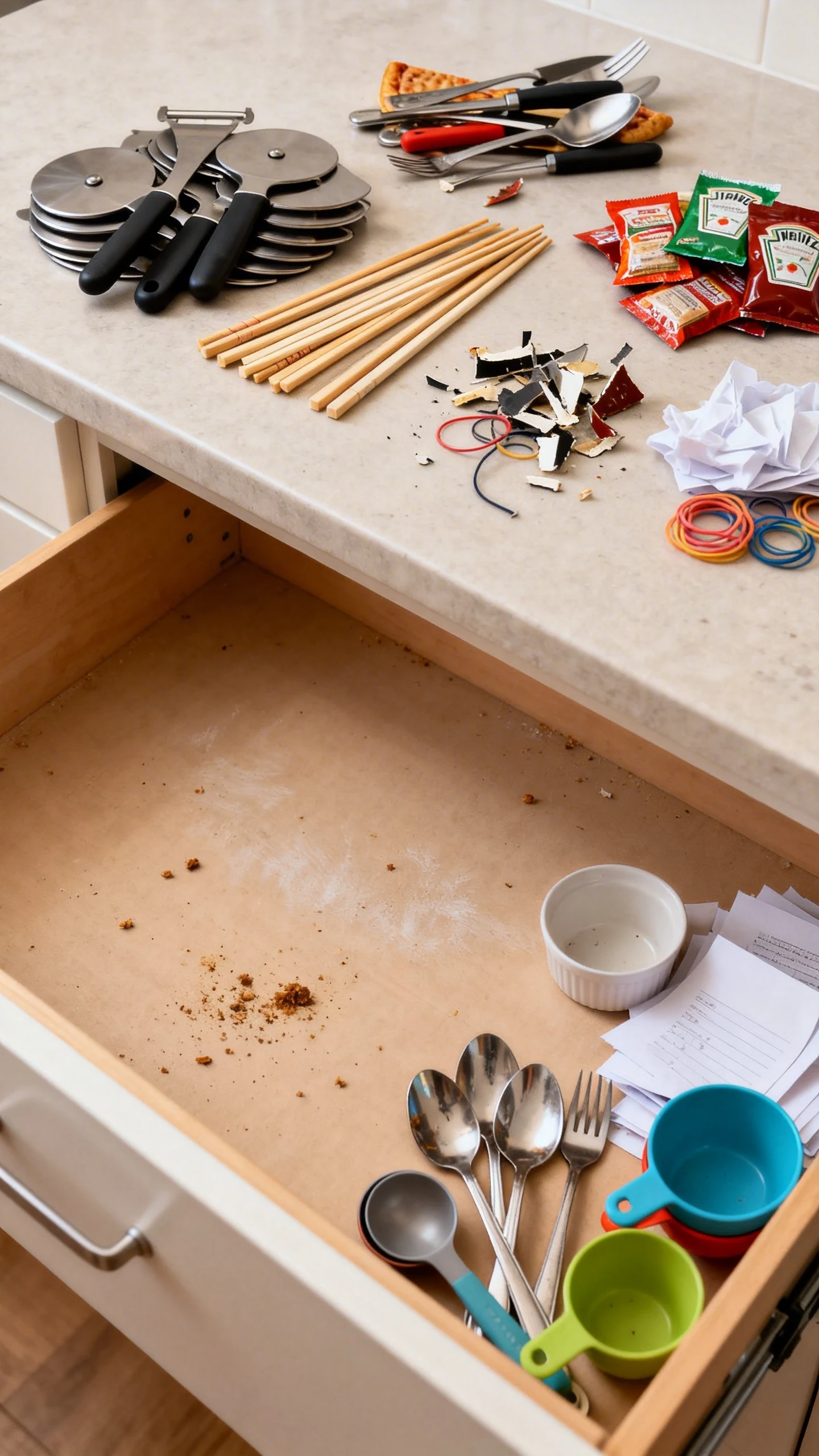 This is where you stop pretending you need six pizza cutters or seventeen takeout chopsticks. Keep what you use, donate what’s still good, and toss the broken, sticky, or deeply suspicious stuff.