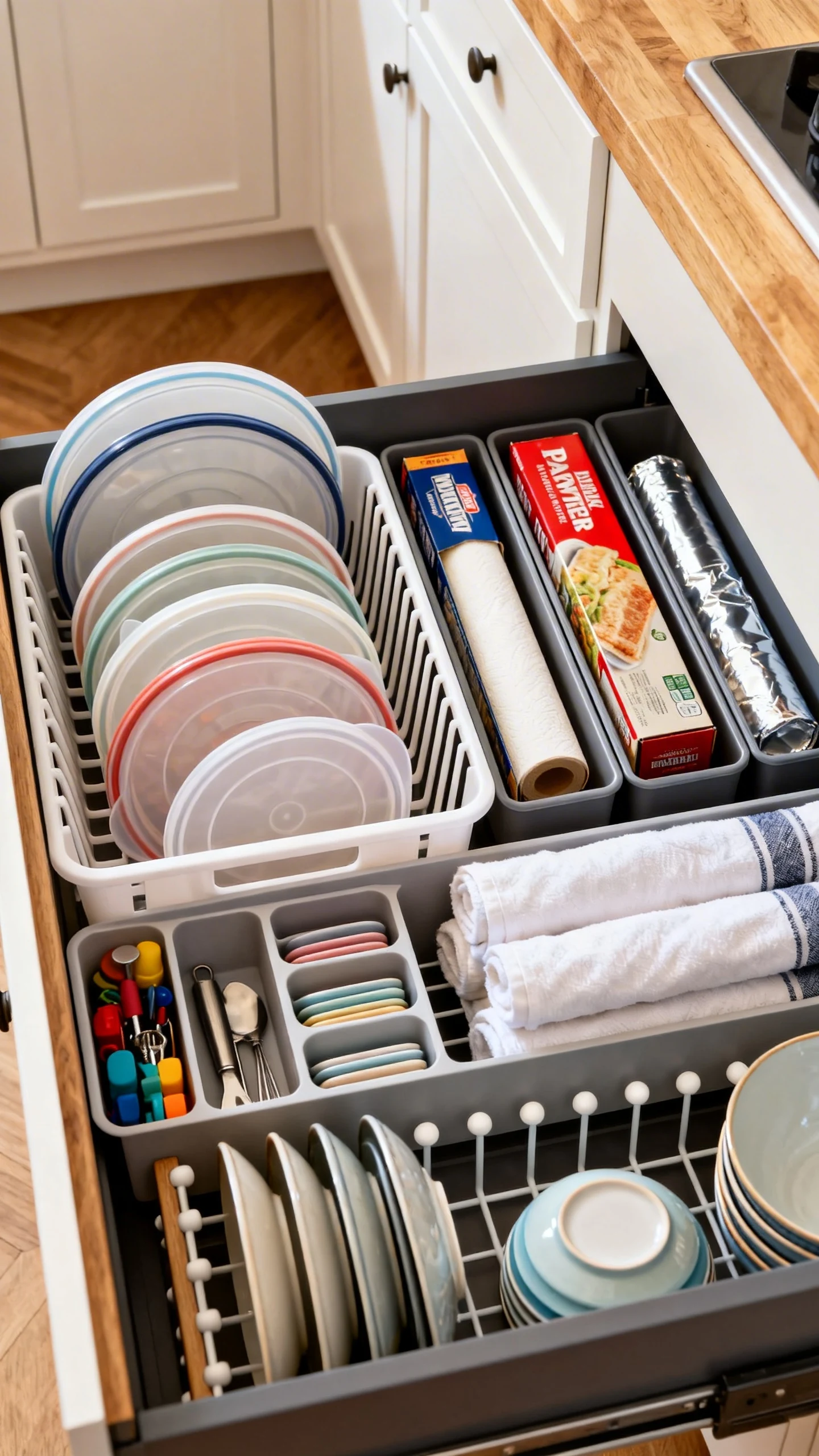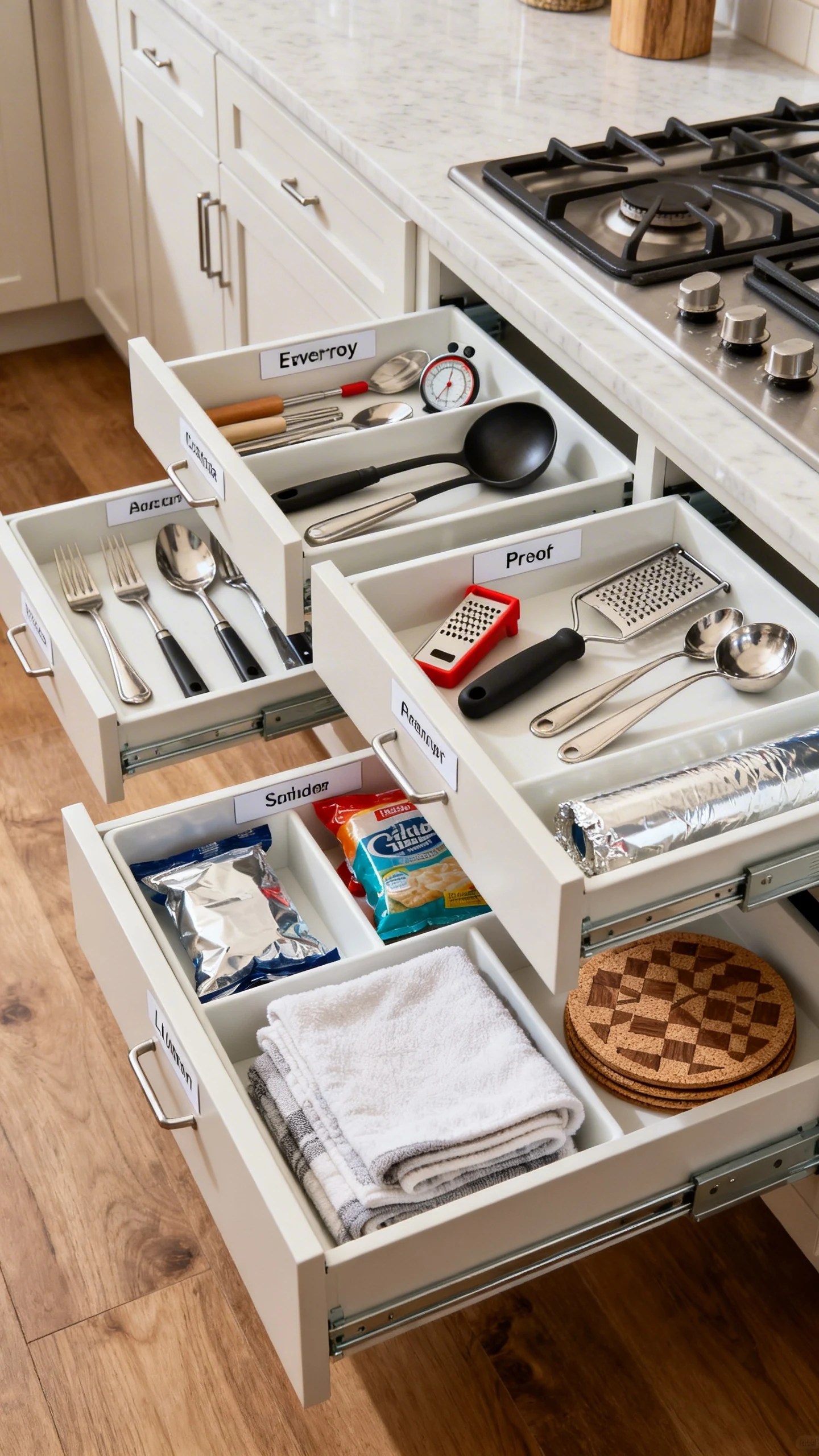 Think of it like assigning jobs. A drawer for prep tools, a drawer for food storage wraps, a drawer for linens, and a drawer for everyday utensils. No more random scissors hanging out with potato mashers for no reason.