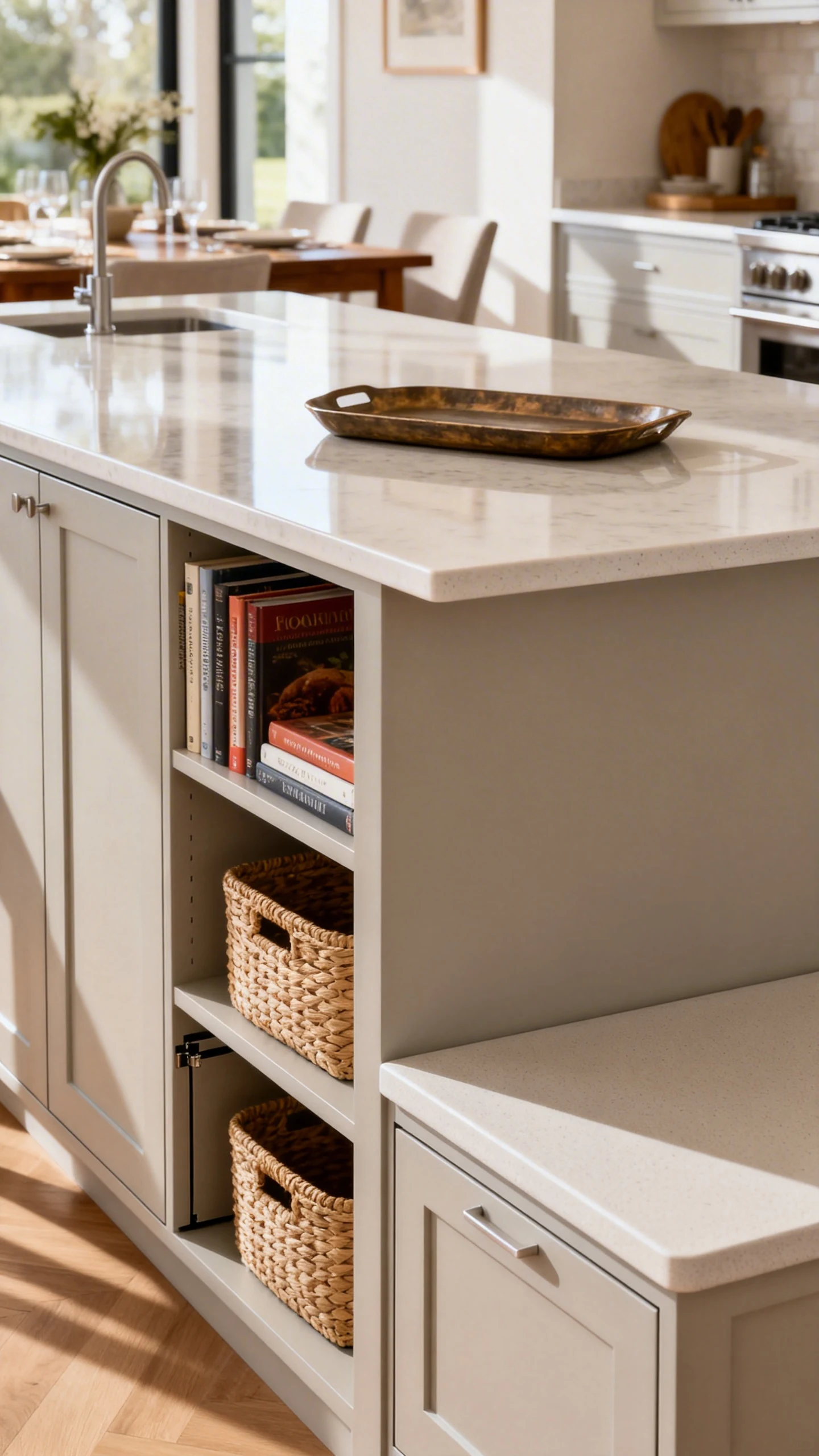 - Cookbooks, trays, and baskets for a styled look