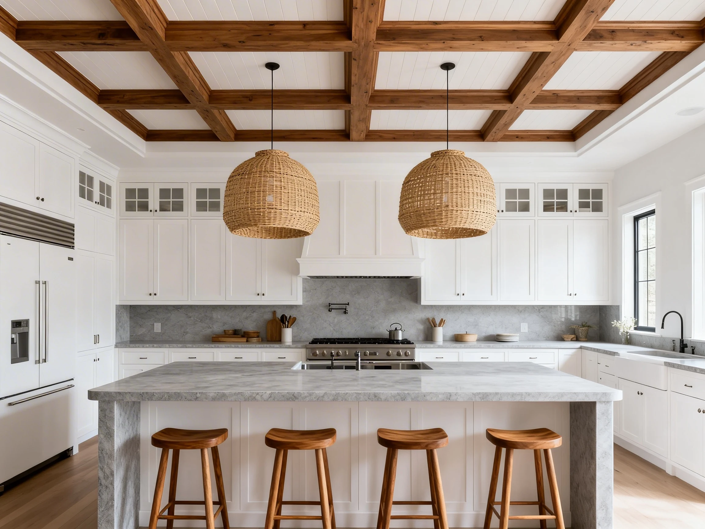 FYI, faux beams can absolutely work if real structural beams are not in the budget. Just make sure the scale matches the island size so the look feels intentional rather than mini and decorative.