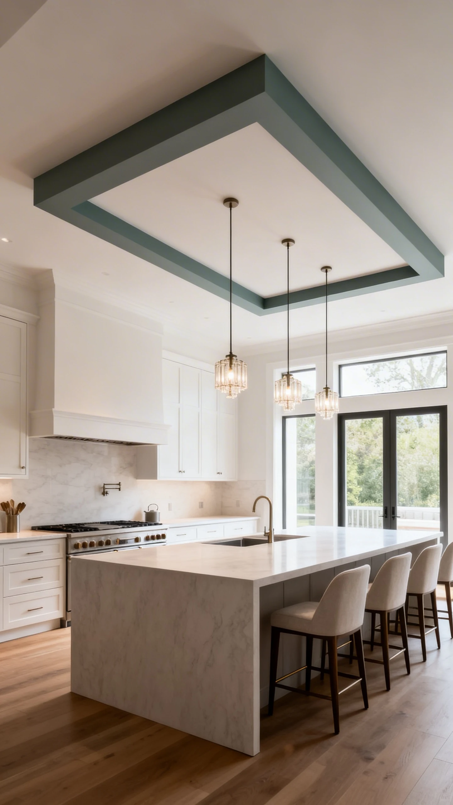 A ceiling box, tray detail, or dropped frame above the island is one of the easiest ways to make that zone feel intentional. It visually anchors the island, makes lighting look more important, and gives the whole kitchen that custom-built vibe people assume cost a fortune.