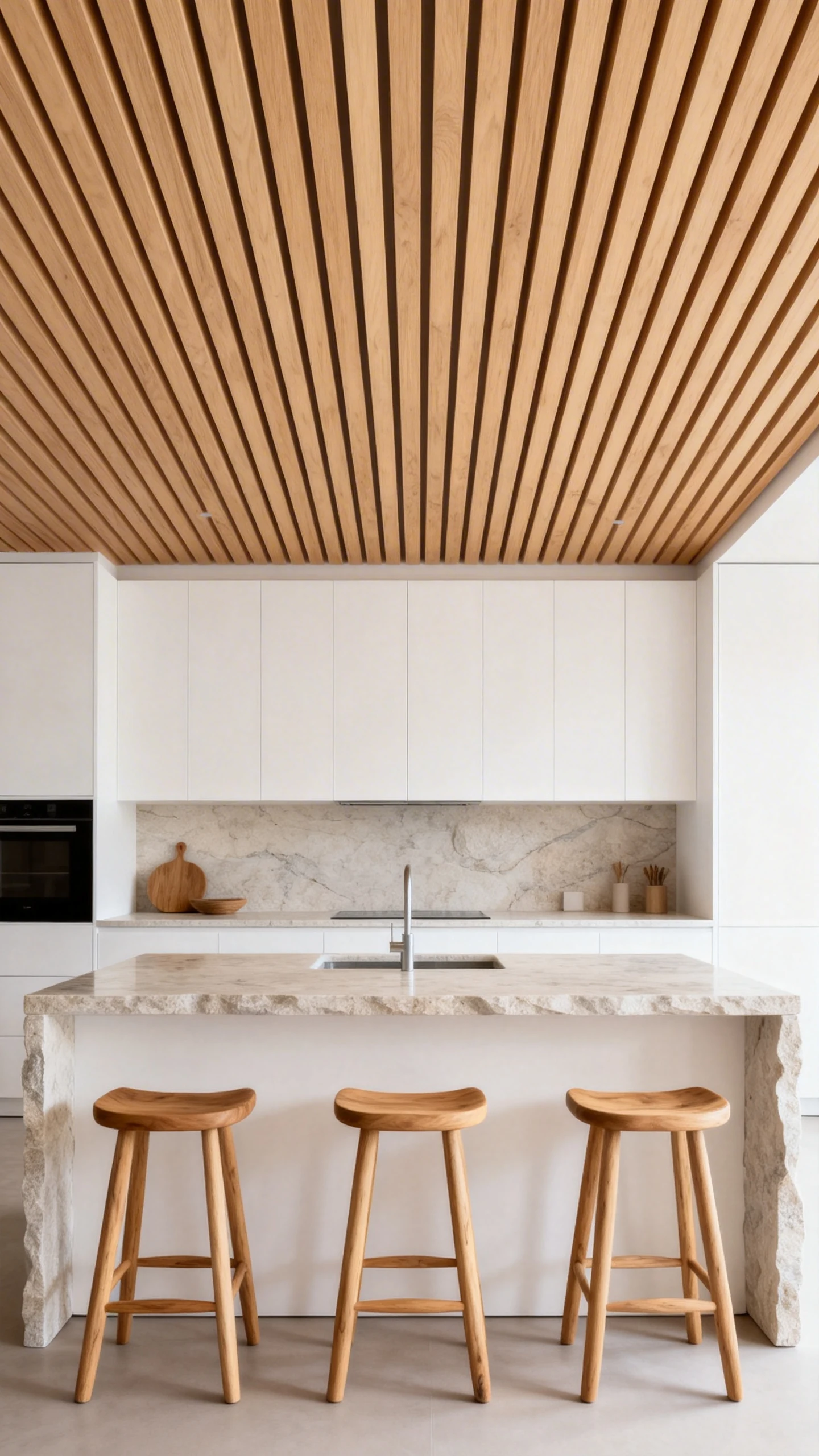 One important note: repeat the wood tone somewhere else in the kitchen. Bar stools, shelving, flooring, or vent hood accents can tie it all together. Otherwise, the ceiling might look like it wandered in from another house.