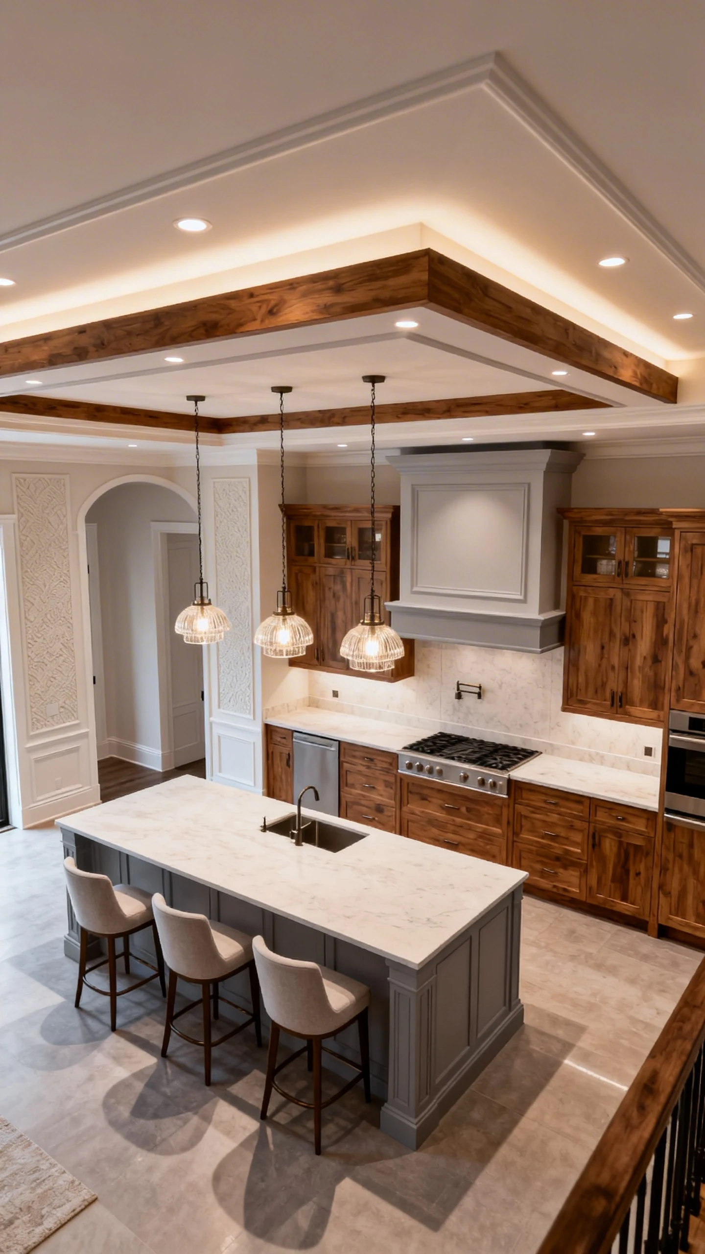 If you love subtle drama, this is your move. Ceiling paneling, decorative trim, beadboard, or even a plaster-style finish above the island can add depth and elegance without needing flashy color or oversized fixtures.
