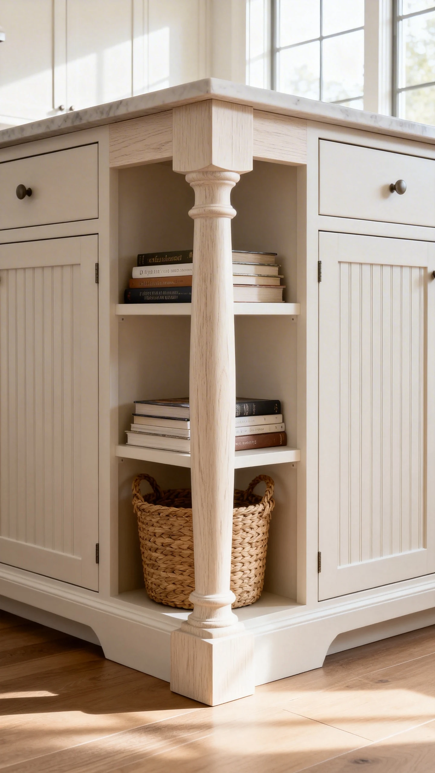 The magic is that columns add vertical structure. Even if your island is just cabinets and a countertop, the columns create a frame that screams “custom millwork,” without you needing to become a woodworking influencer.