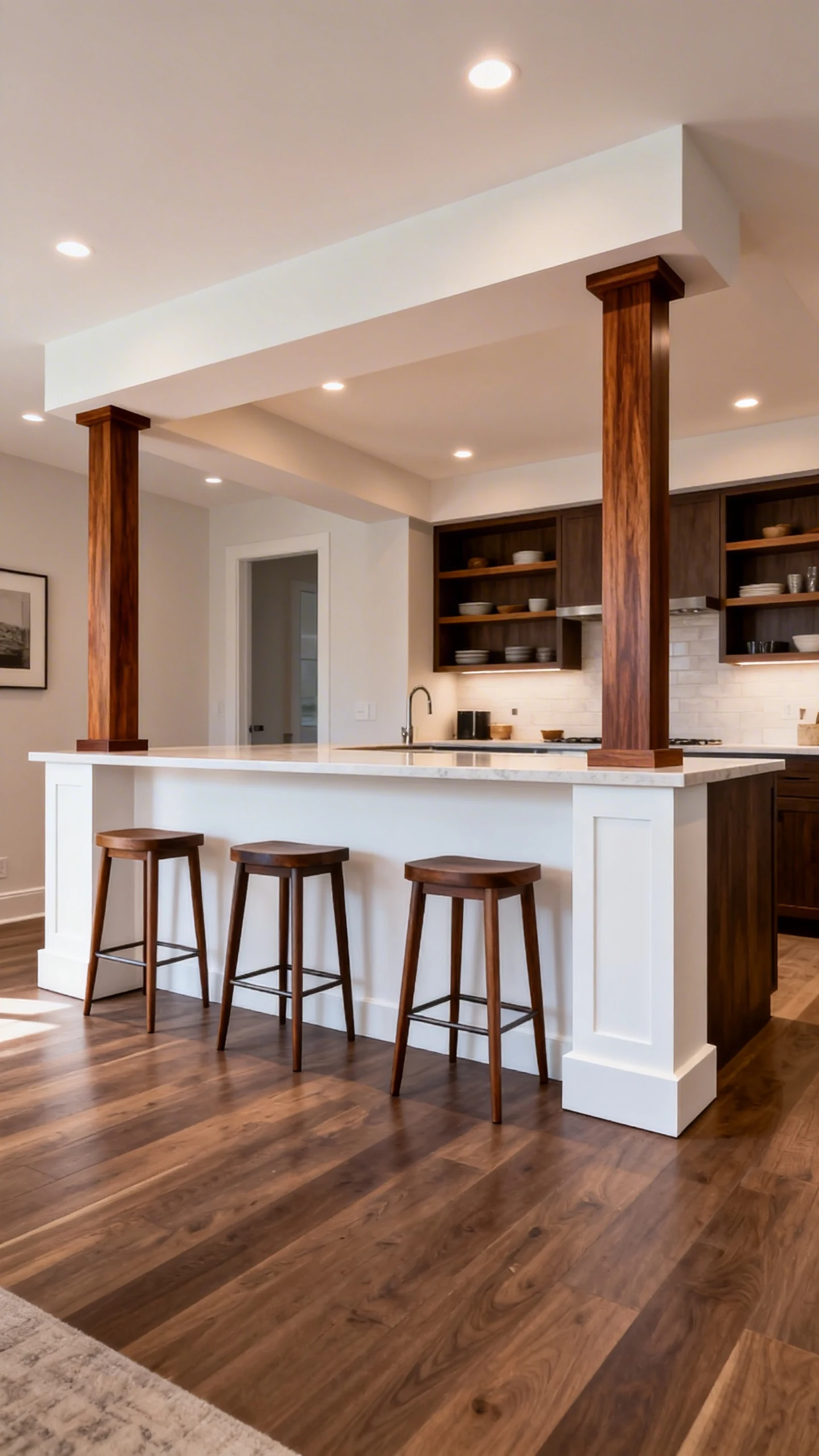 You know that light, breezy island that looks like it belongs in a magazine but still feels warm? That’s the vibe tapered columns bring. They’re a little more “designed” than square columns, but not overly ornate.