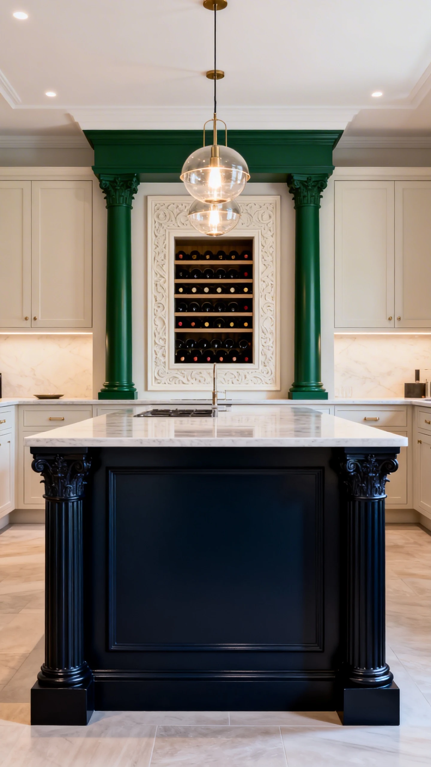 - Use double columns to frame a decorative panel, wine storage, or a built-in shelf niche.