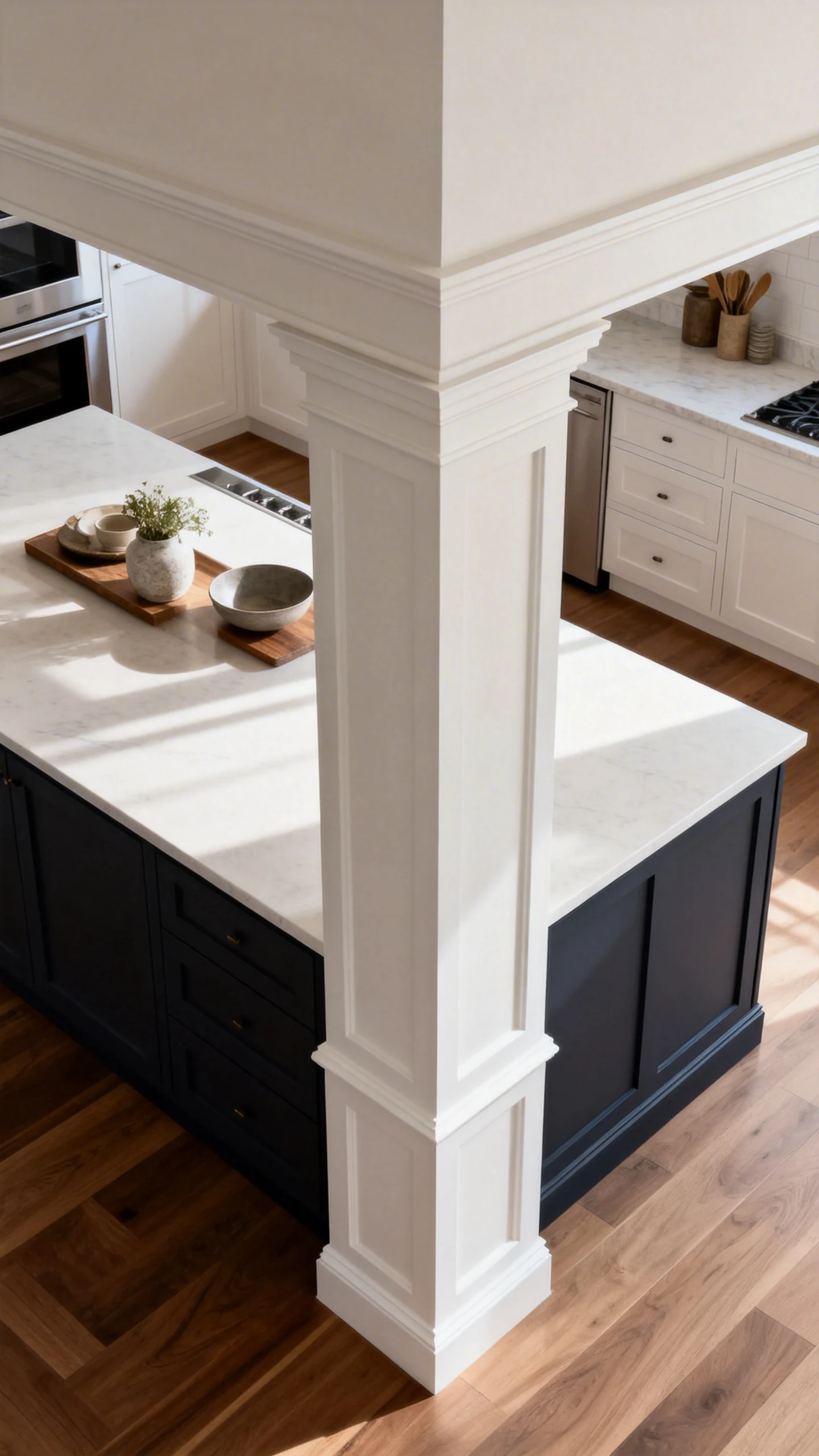 FYI: square columns also look amazing with a waterfall countertop if you keep the column details minimal. Too many lines fighting each other is how you end up with a kitchen island that looks… confused.