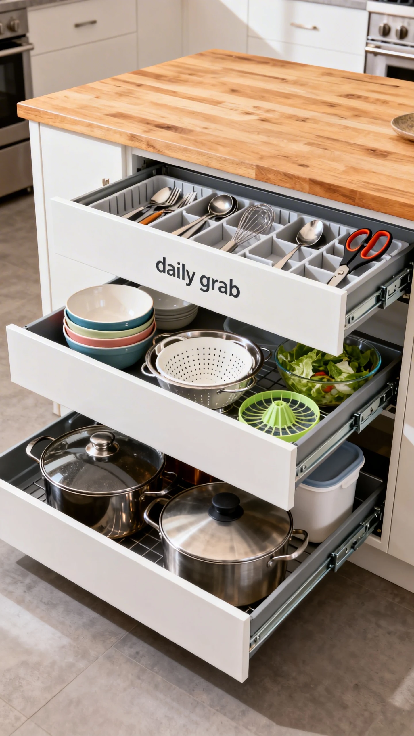 Give each drawer a job. When every drawer becomes “miscellaneous,” your island becomes a junk museum.
