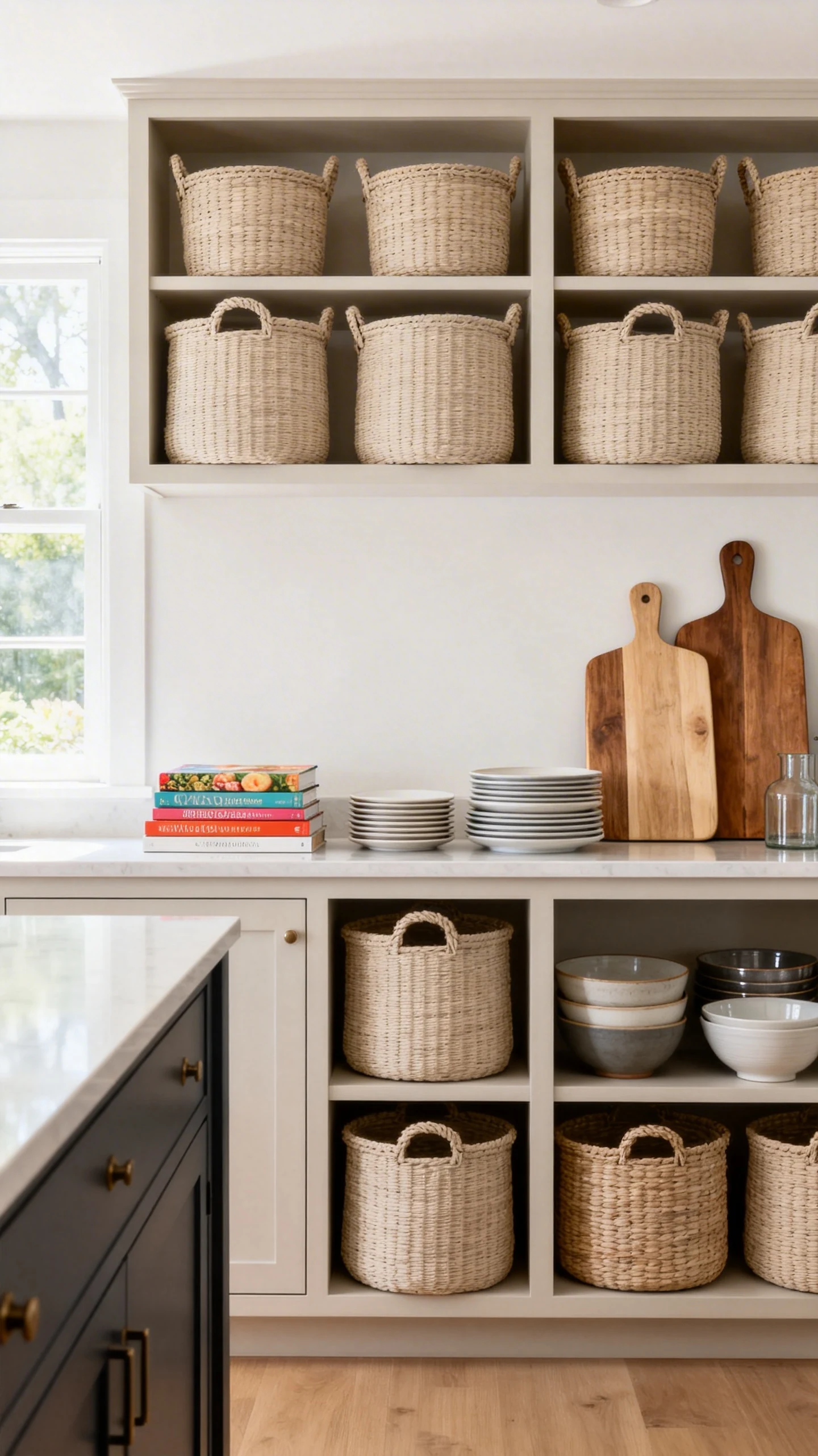 This is where you hide the “not pretty but necessary” stuff. Bulk snacks, small appliances, the mixing bowls that multiply when you’re not looking.