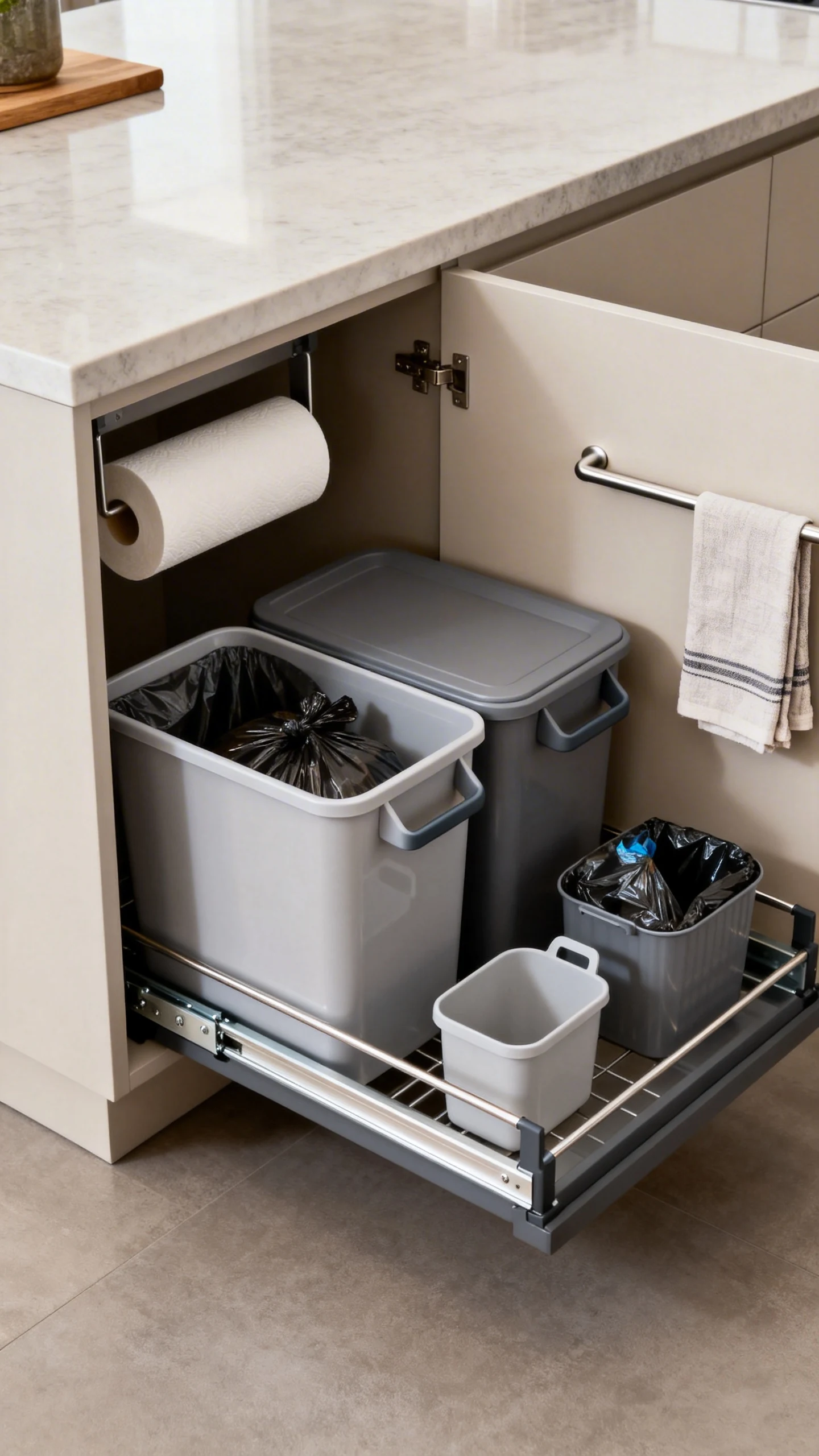 This one isn’t glamorous, but it’s the kind of smart that makes your kitchen feel like it runs itself. A dedicated pull-out trash and recycling zone inside the island keeps everything close to your prep area—without staring at a can all day.
