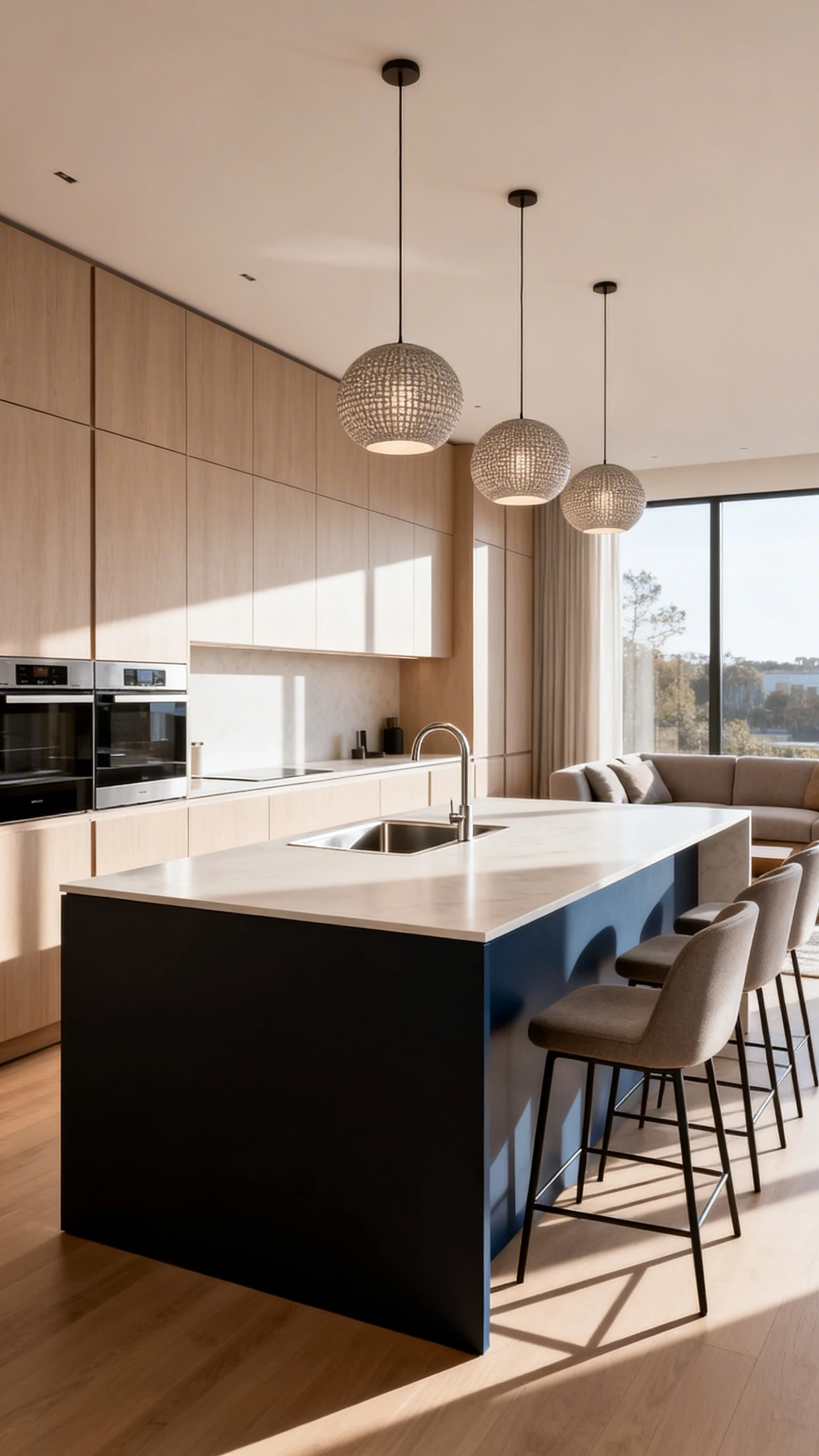 - Use a statement pendant trio above the island to anchor the whole space.