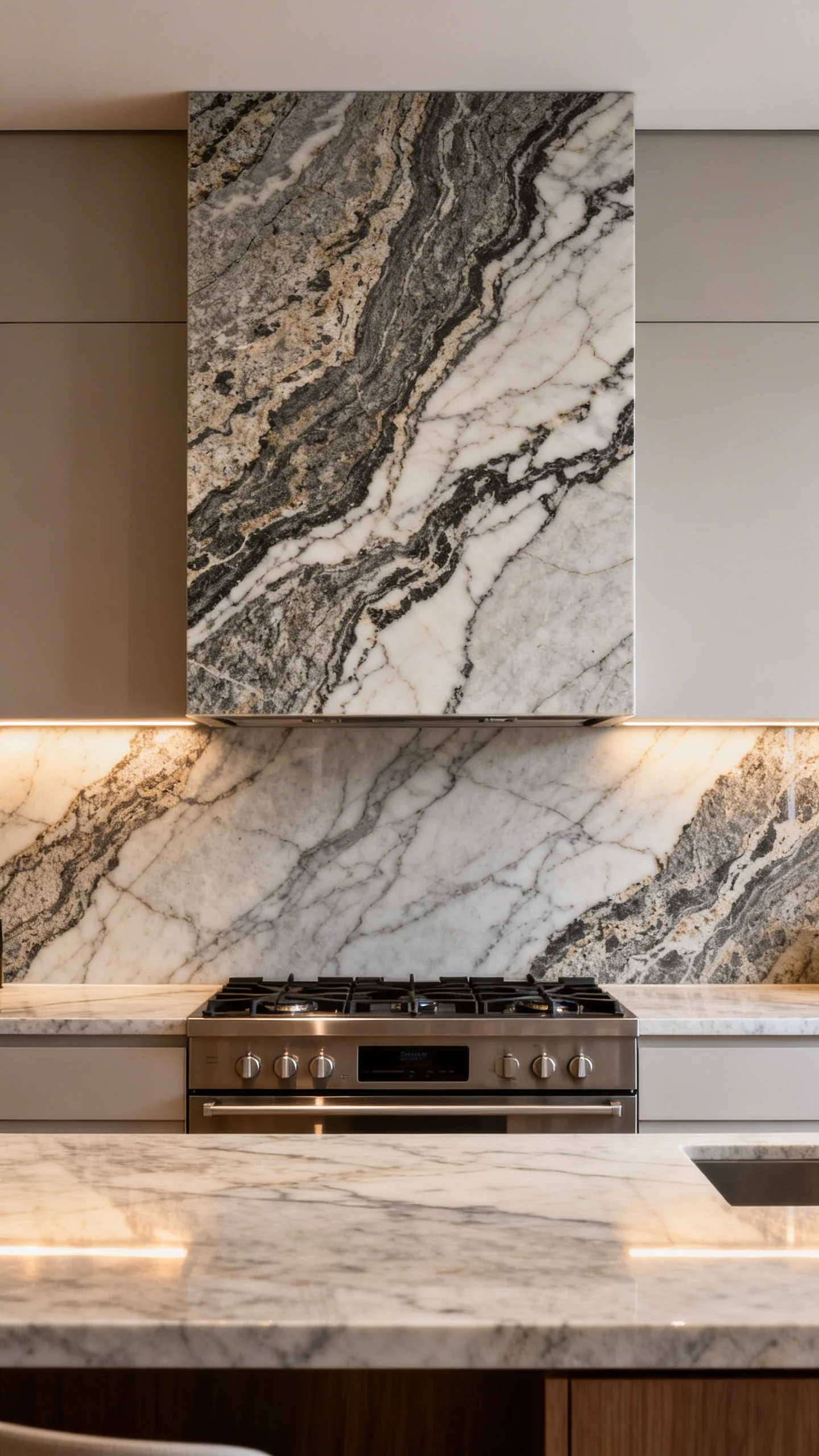 If you want instant “custom kitchen” vibes, a full-height slab backsplash behind the stove is the cheat code. It looks high-end because it literally is one uninterrupted piece of stone-like goodness.