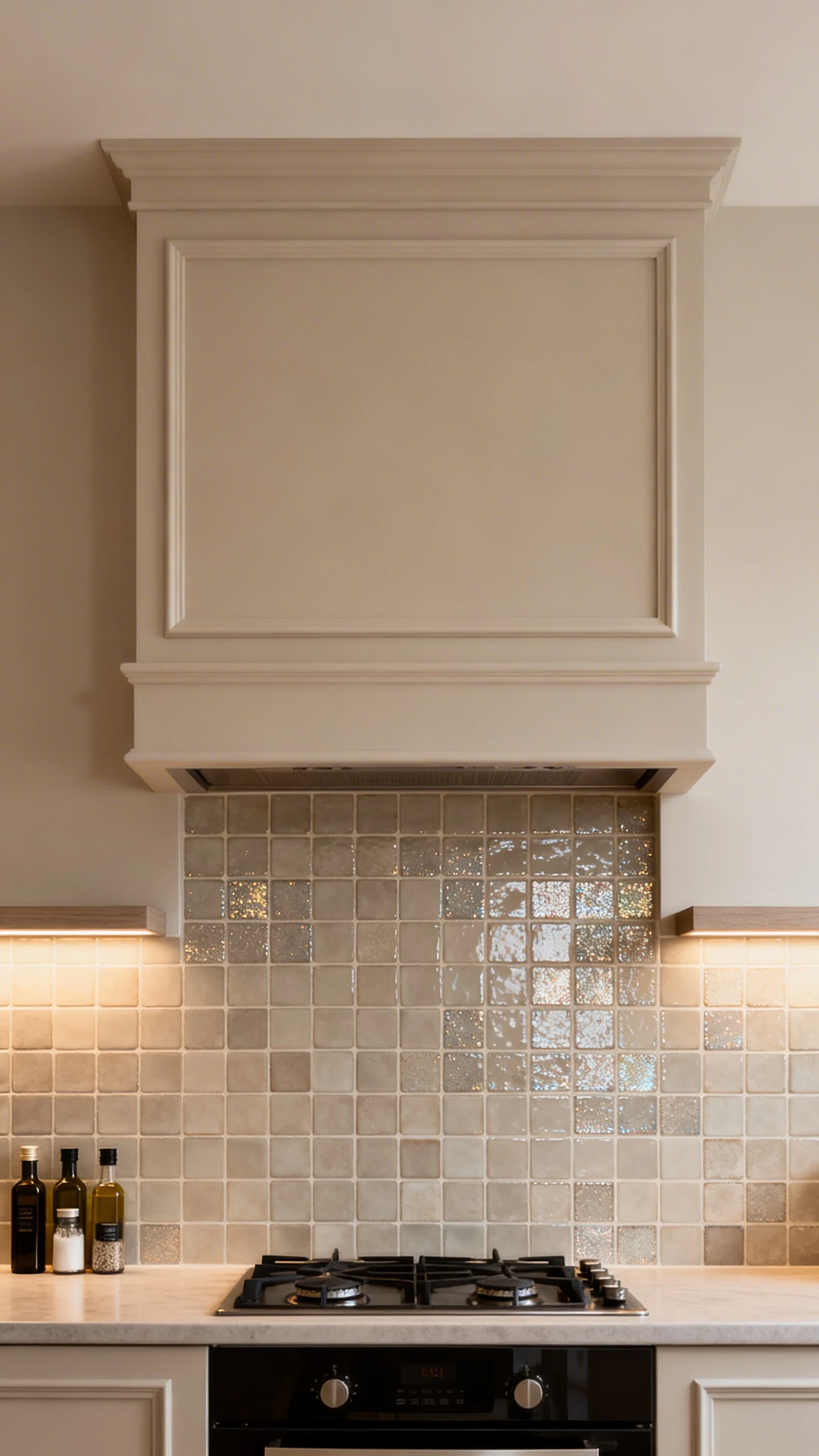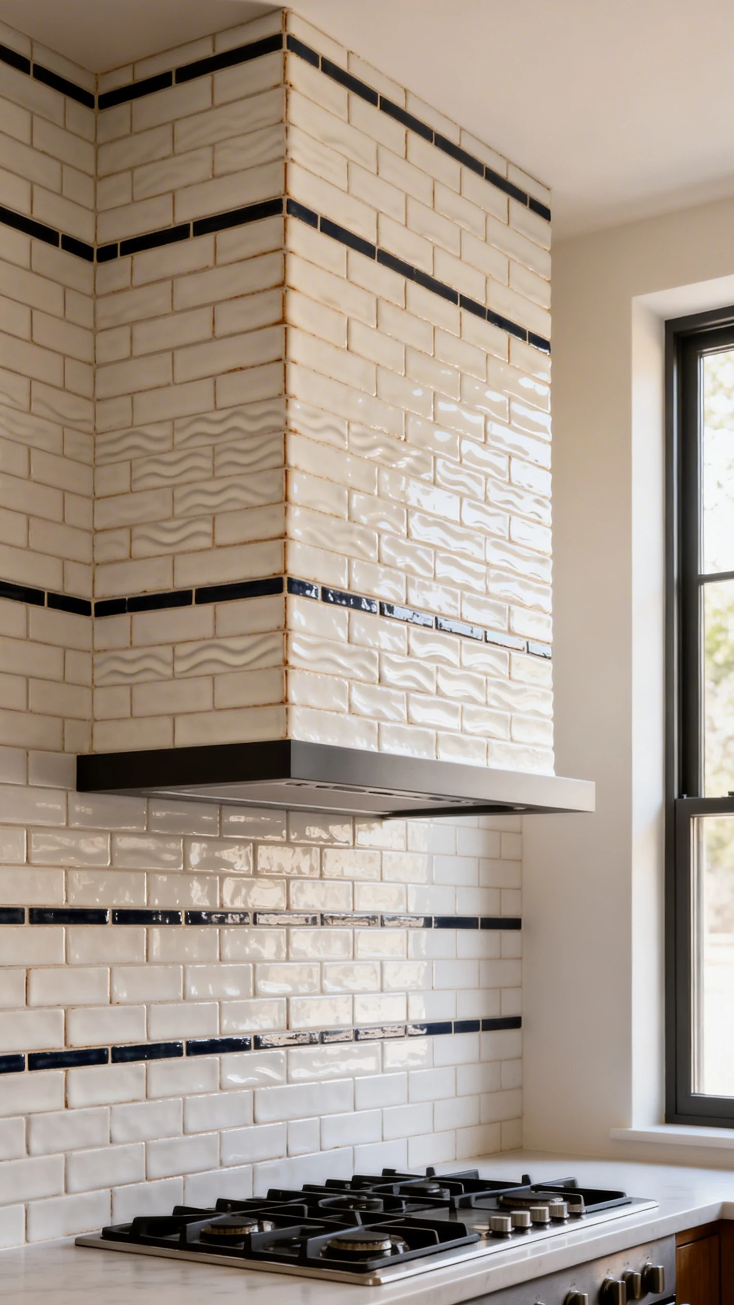 - Tile the stove wall from counter to hood, then frame it with trim like a panel.