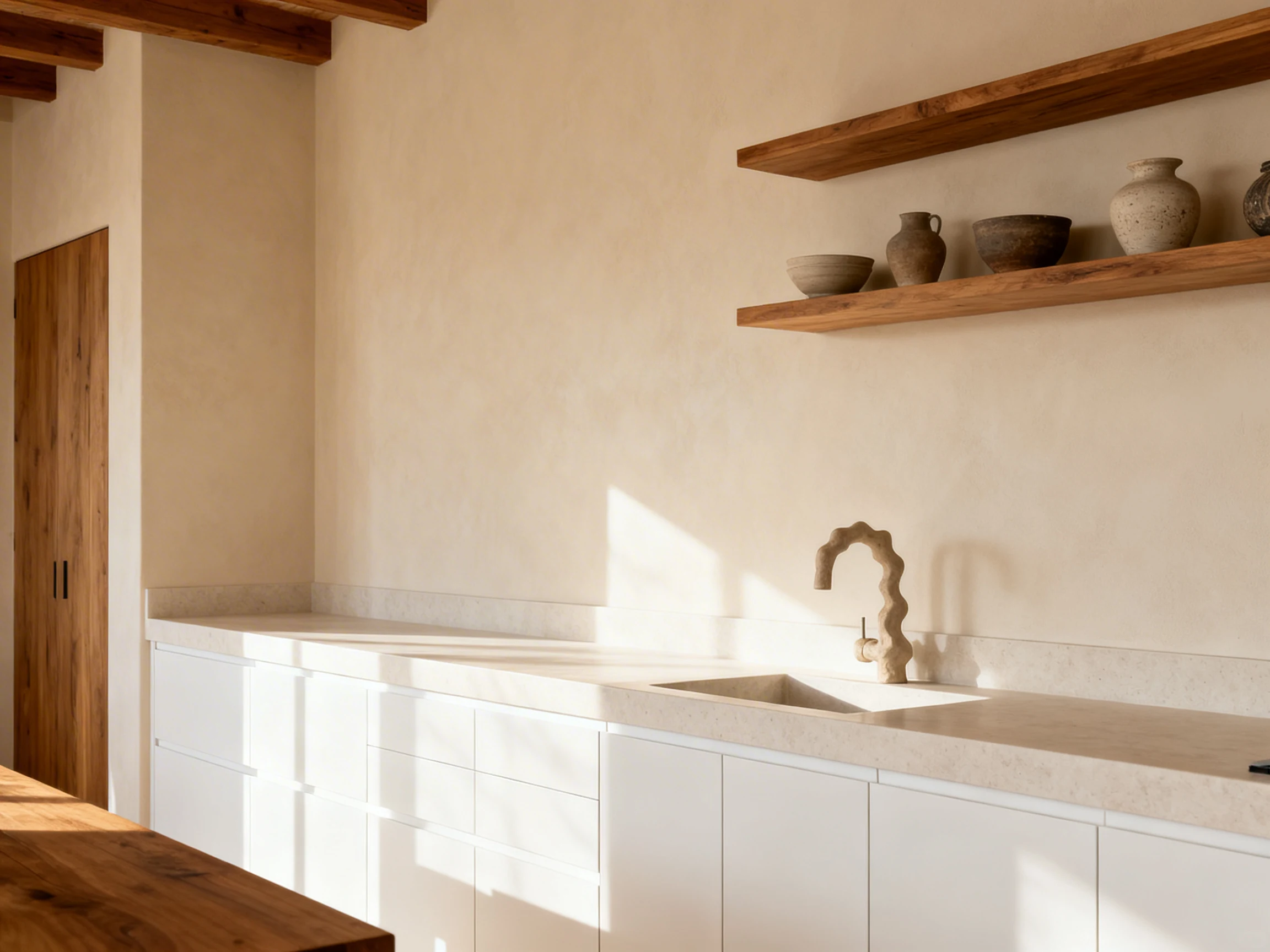 Want a no-backsplash kitchen that still feels rich and layered? Add texture to the wall itself. I’m talking limewash paint, a smooth plaster look, or even subtle paneling.