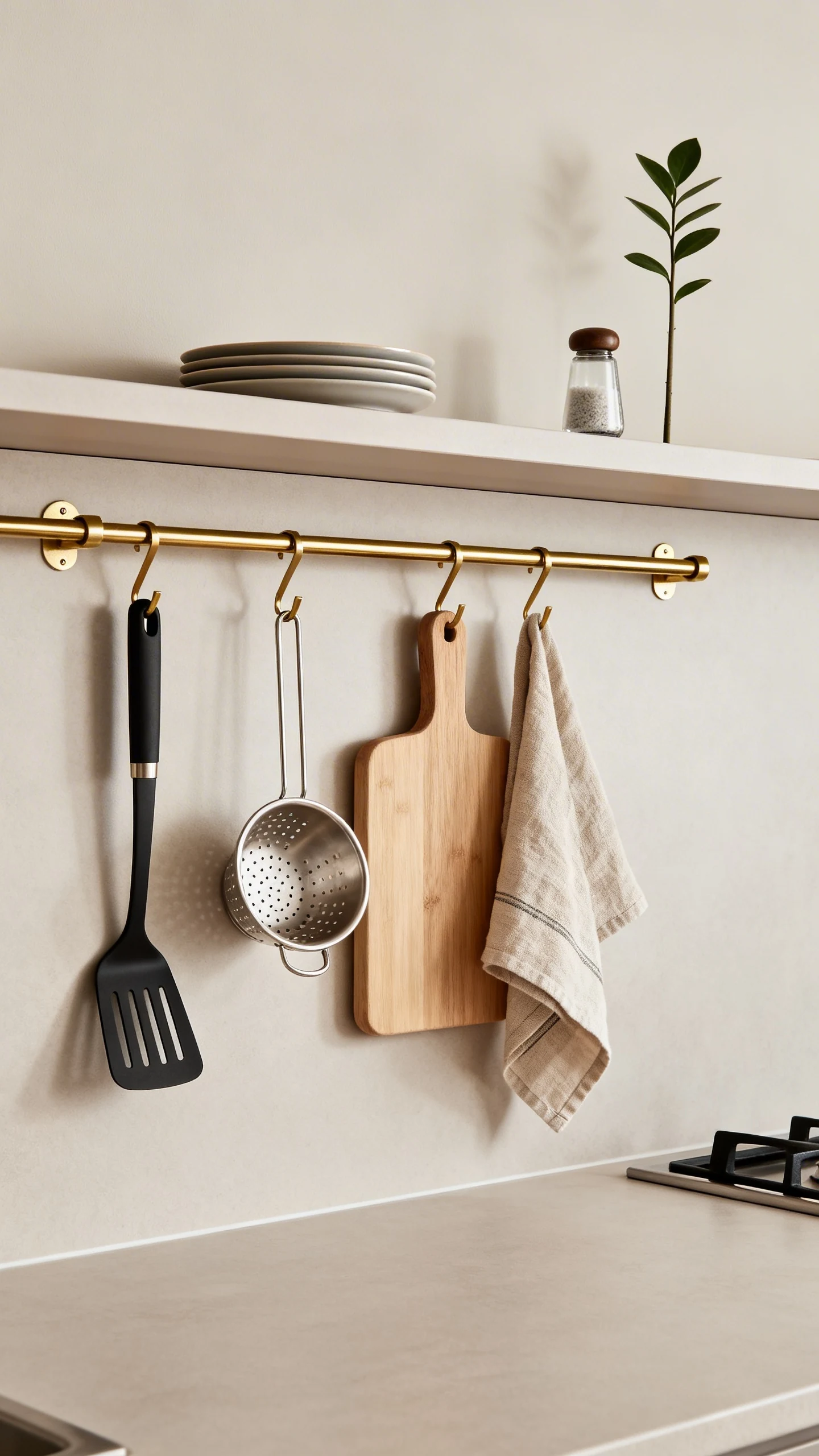 - Install a brass or black rail and hang a few essentials: spatula, small colander, mini cutting board.