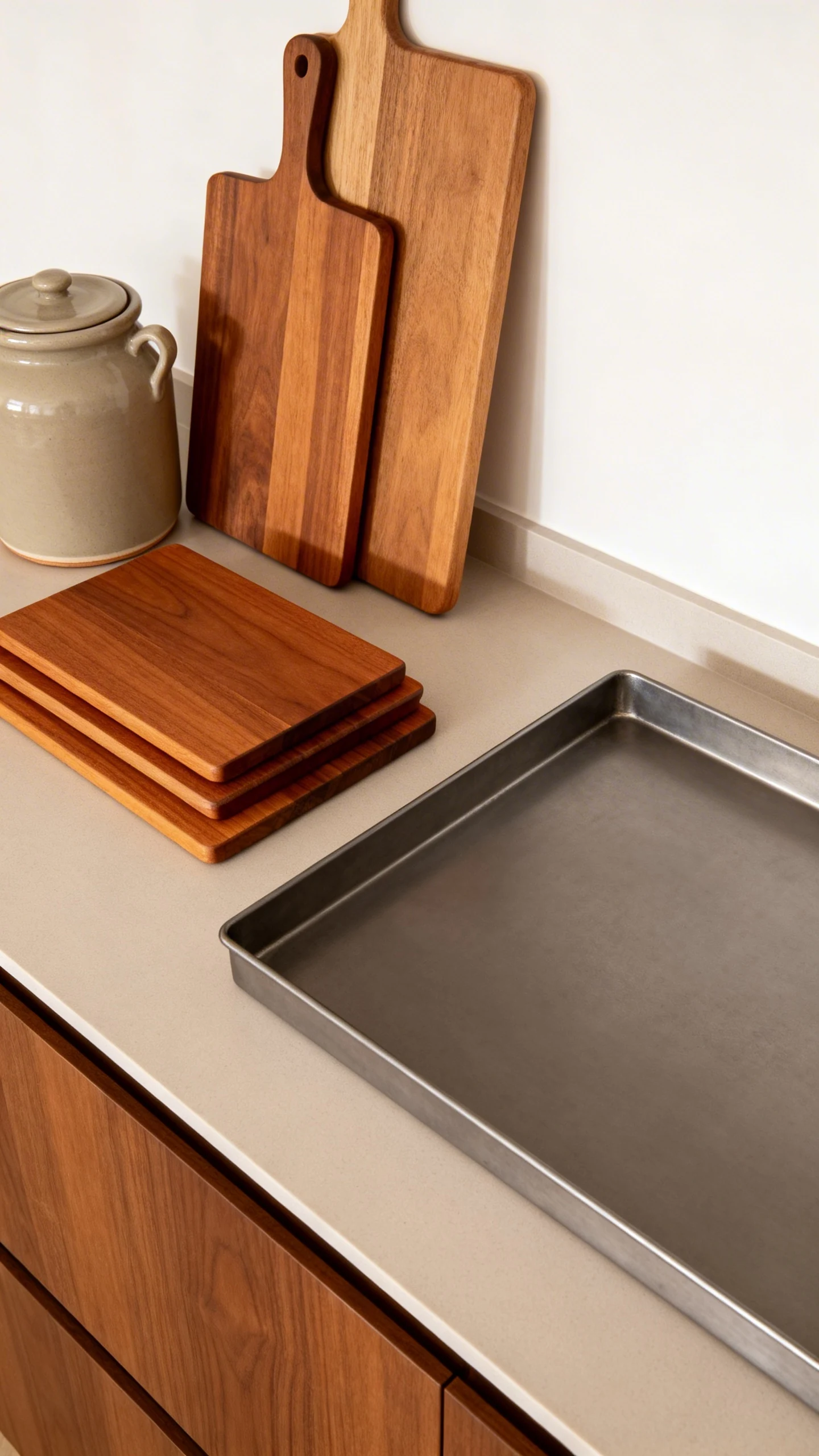 Keep your countertop decor minimal and repeat a couple of materials. For example: warm wood boards, a ceramic crock, and a metal tray. That’s it. You want “styled,” not “kitchen store aisle.”