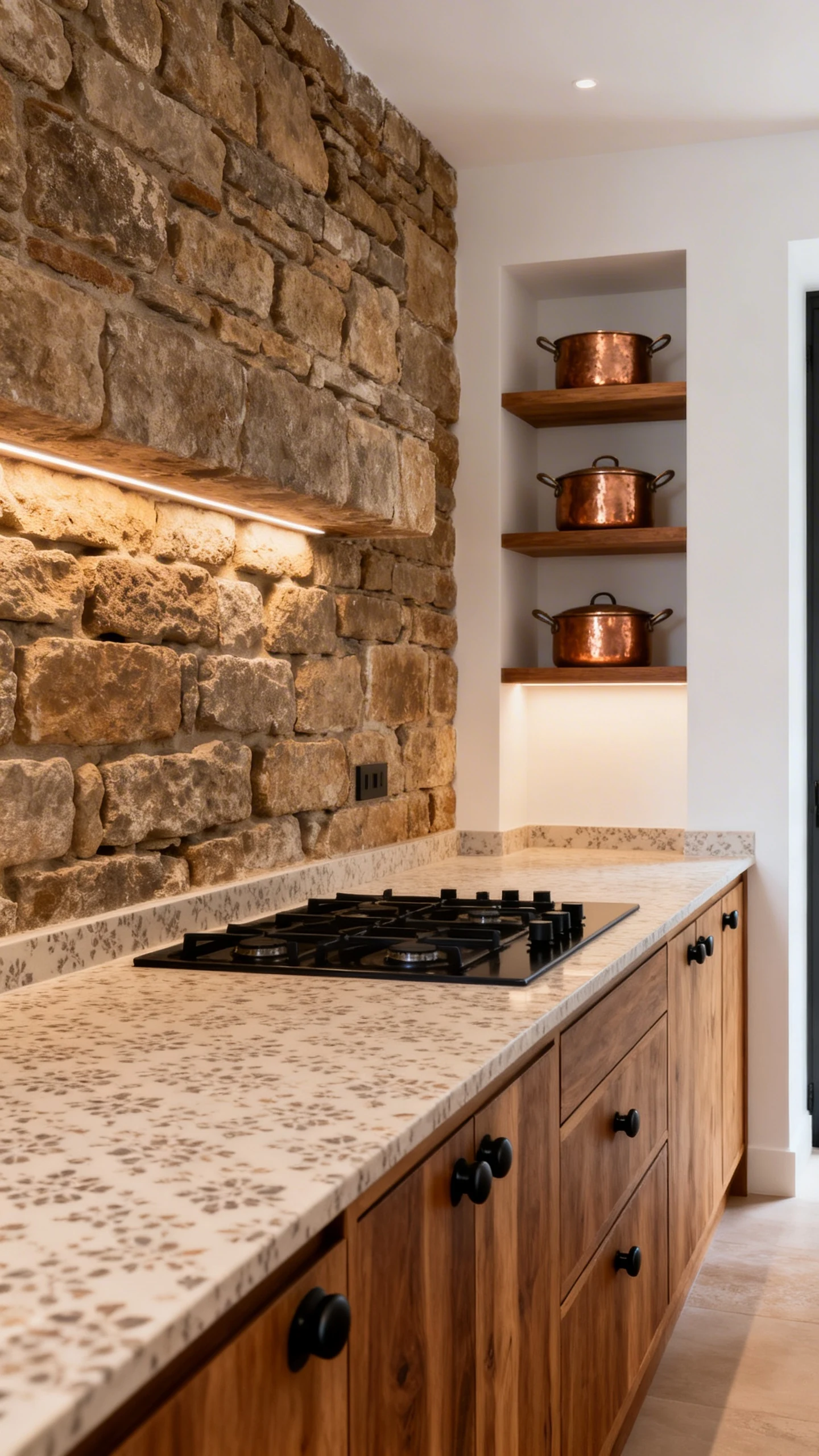 The best part? Stone plays nicely with pretty much everything: wood cabinets, open shelving, black hardware, copper pots you swear you use.