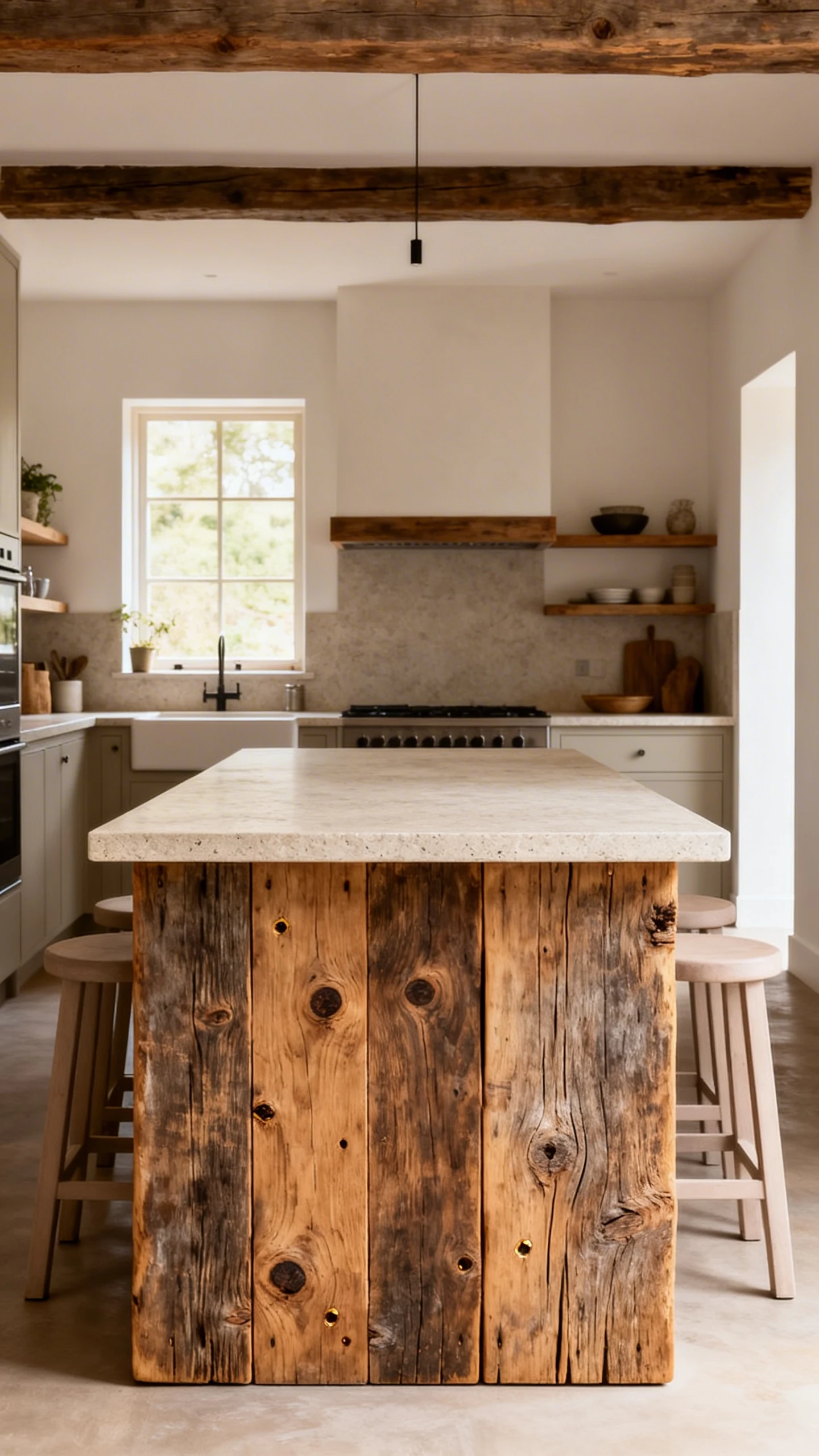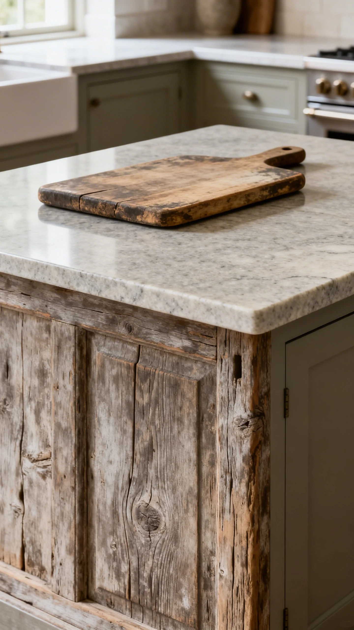 A reclaimed wood island works because it adds age and texture fast. You get that cozy, layered look without having to wait 30 years for your cabinets to develop a personality.