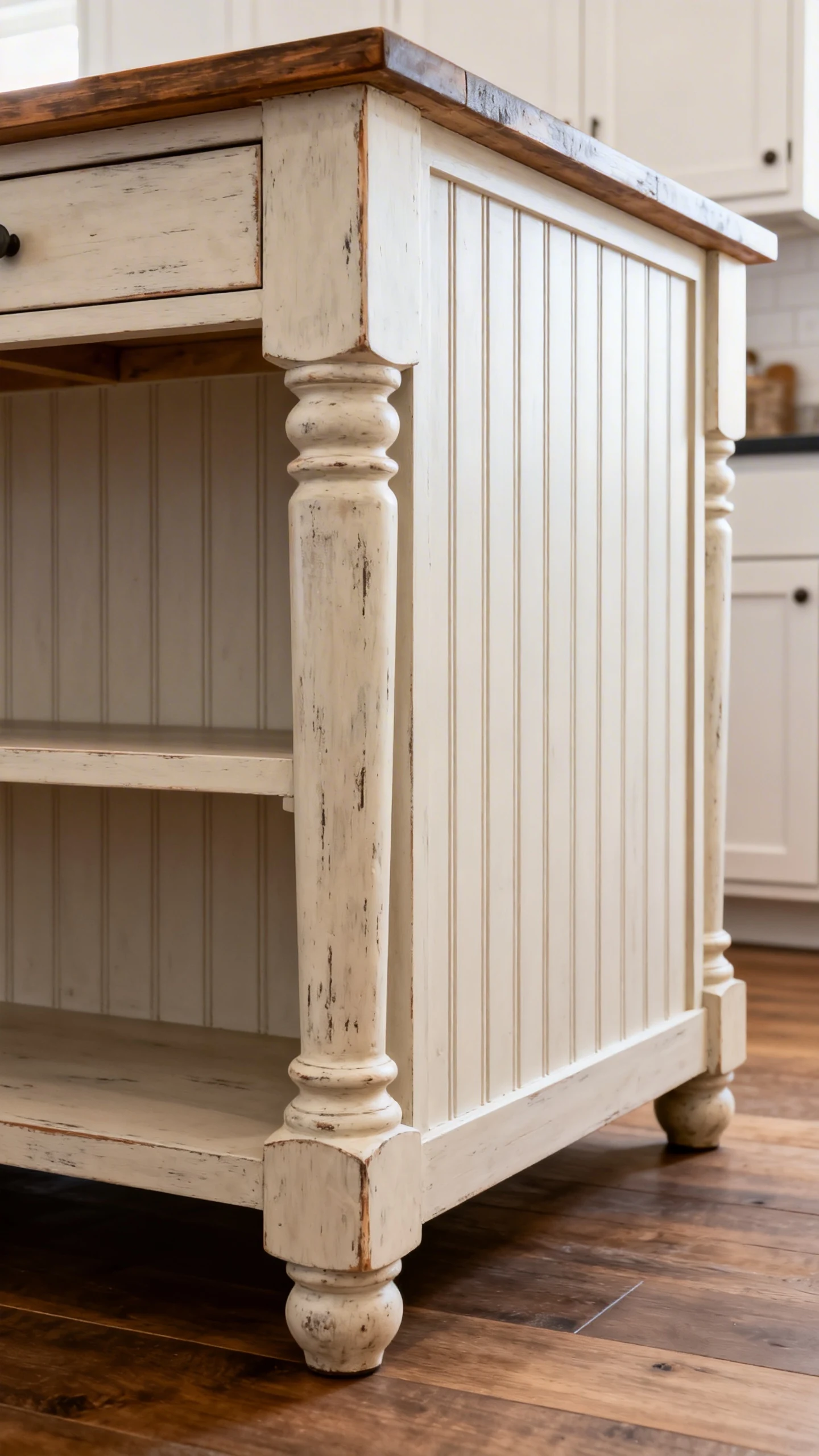 Think turned legs, thick corner posts, beadboard panels, or X-brace sides. These details add shape and charm without making the island look fussy.
