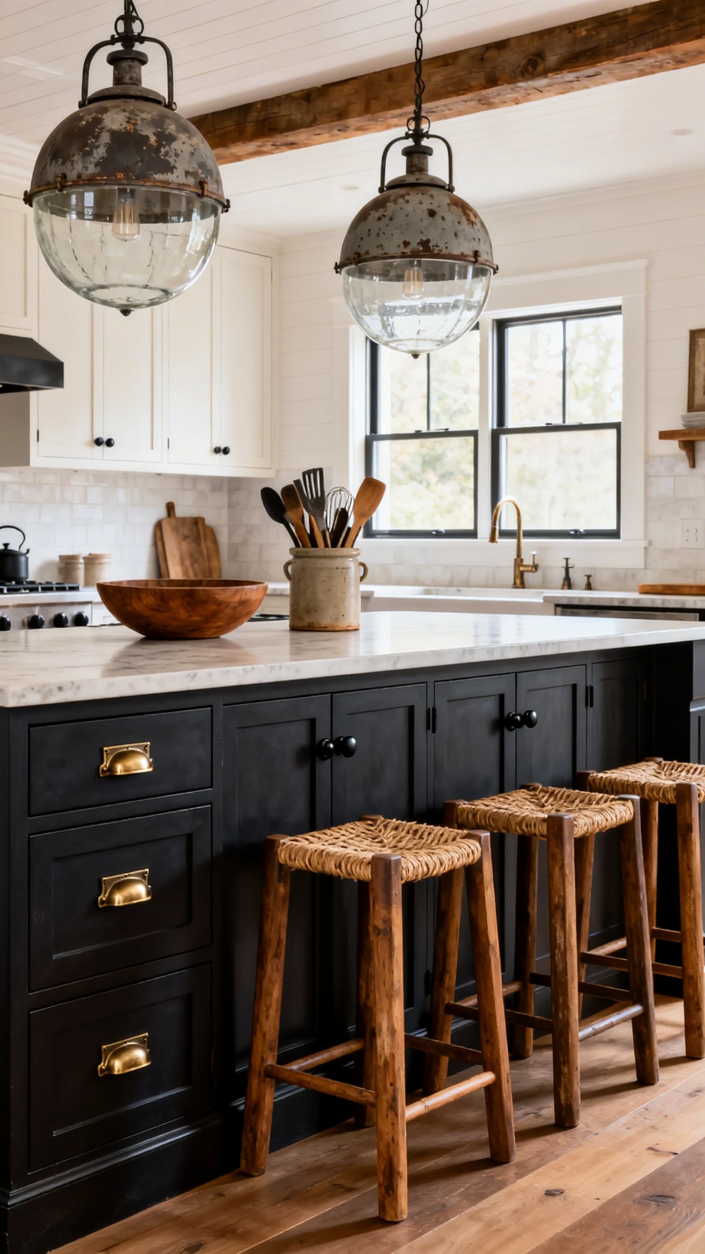 If your rustic island feels a little unfinished, look at the stools, pendants, hardware, and accessories around it. Those pieces create the mood and make the whole setup feel intentional instead of random.
