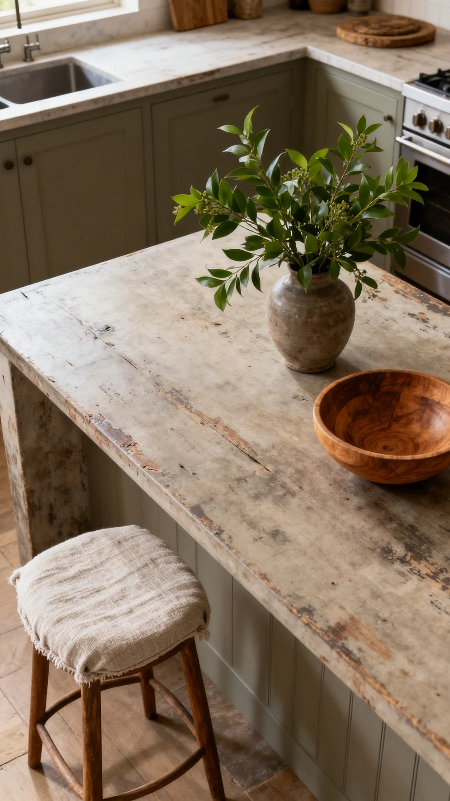 Want a rustic kitchen island idea that feels cozy and elevated? Mix a weathered wood base with a stone countertop. It’s one of those combinations that looks expensive, timeless, and a little bit accidental in the chicest possible way.
