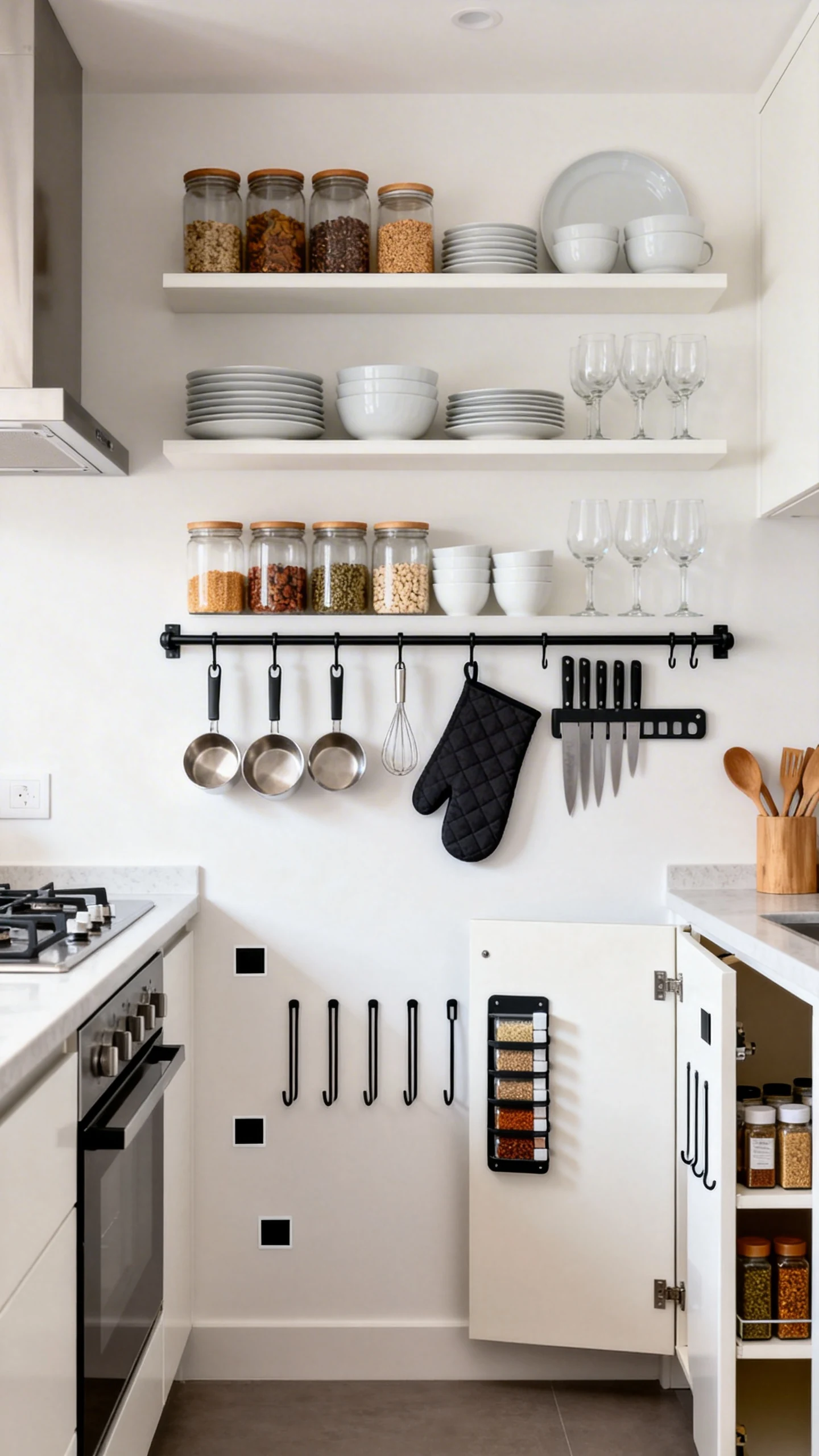 A blank wall in a small kitchen is basically a missed opportunity. Add open shelves, a slim rail system, or hooks for tools you use all the time.