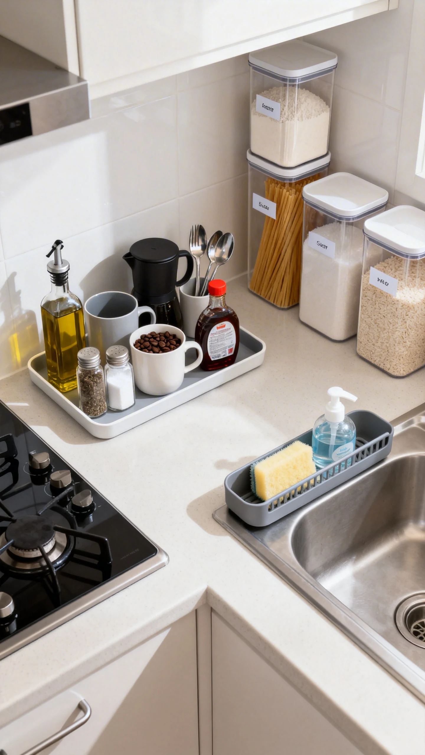 Counters in a small kitchen matter more than people think. Even a little clutter can make the whole room feel cramped, messy, and mildly aggressive.
