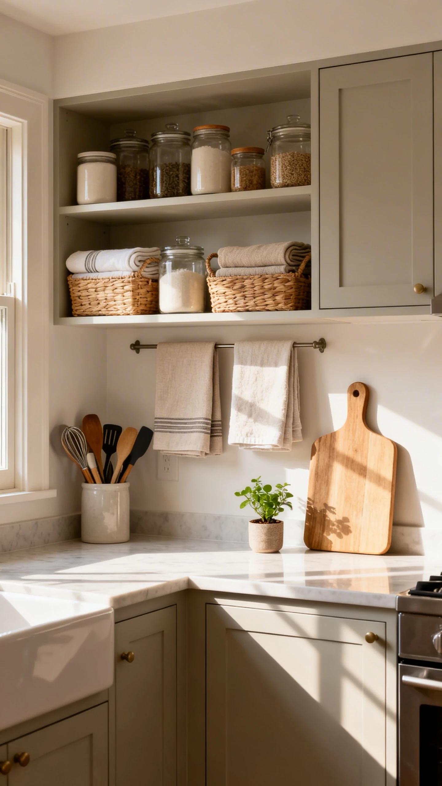 But if your tiny kitchen is trying to hold doubles of everything, no basket in the world is going to save it. A good edit creates breathing room, and then styling makes that room feel intentional.