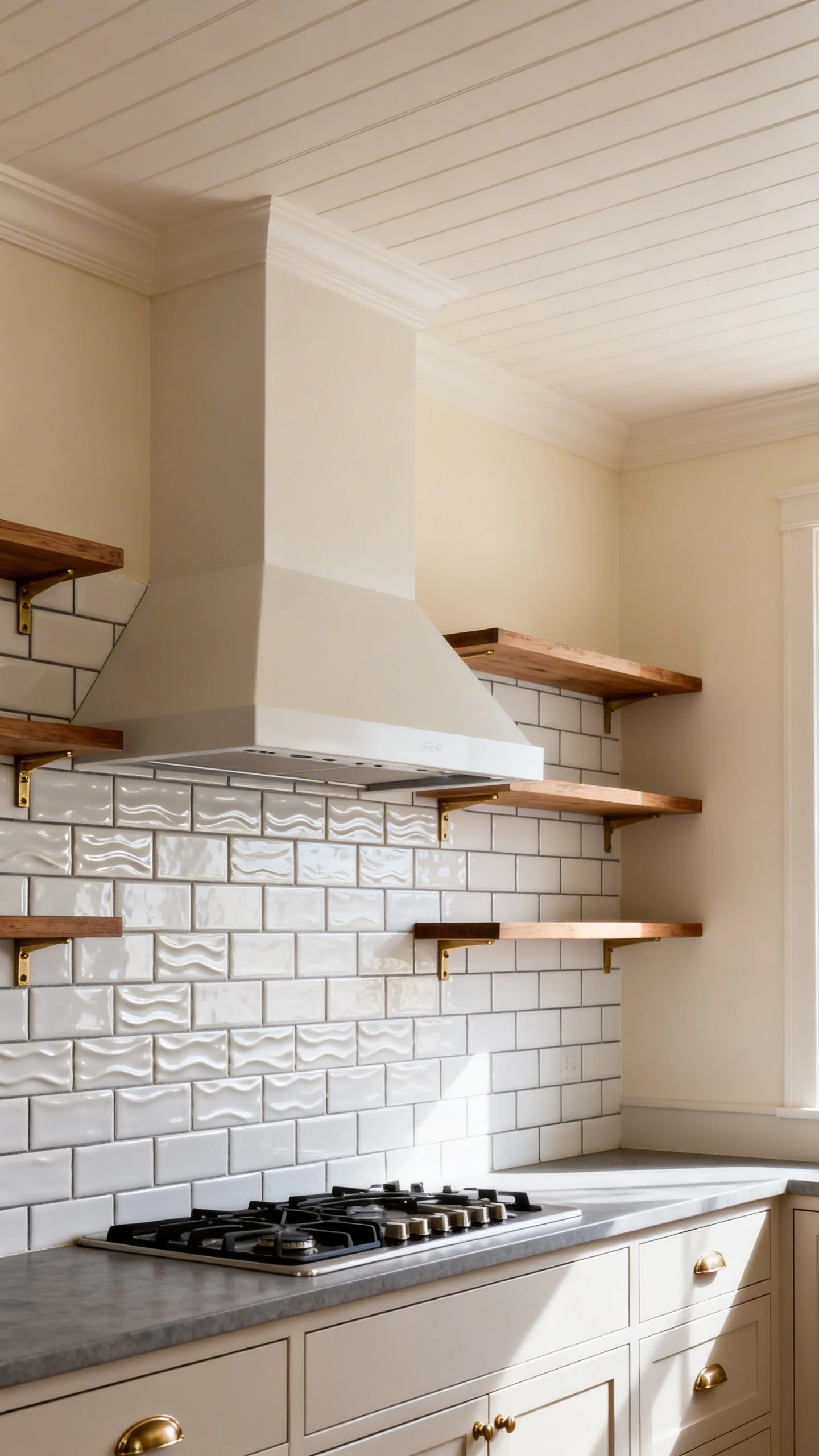- Subway tile + open wood shelves: warmth, texture, and instant styling opportunities.