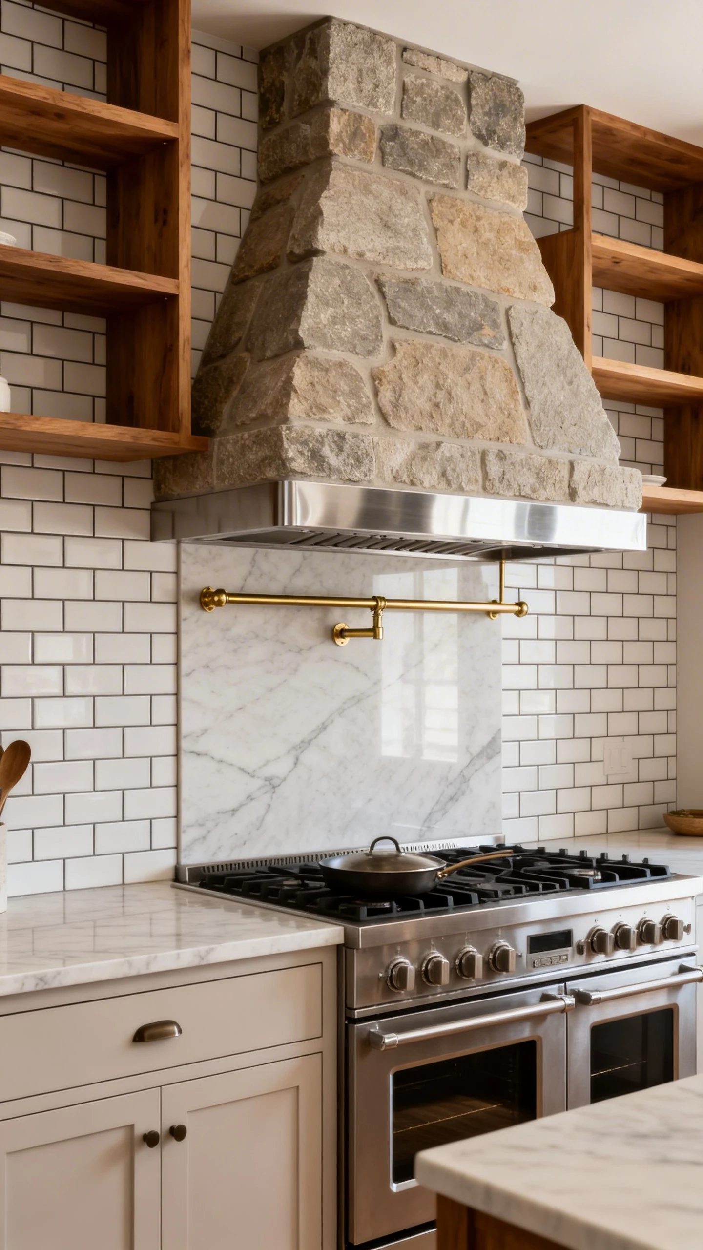 - Subway tile + stone range hood: soft, organic, and very “Pinterest reveal.”