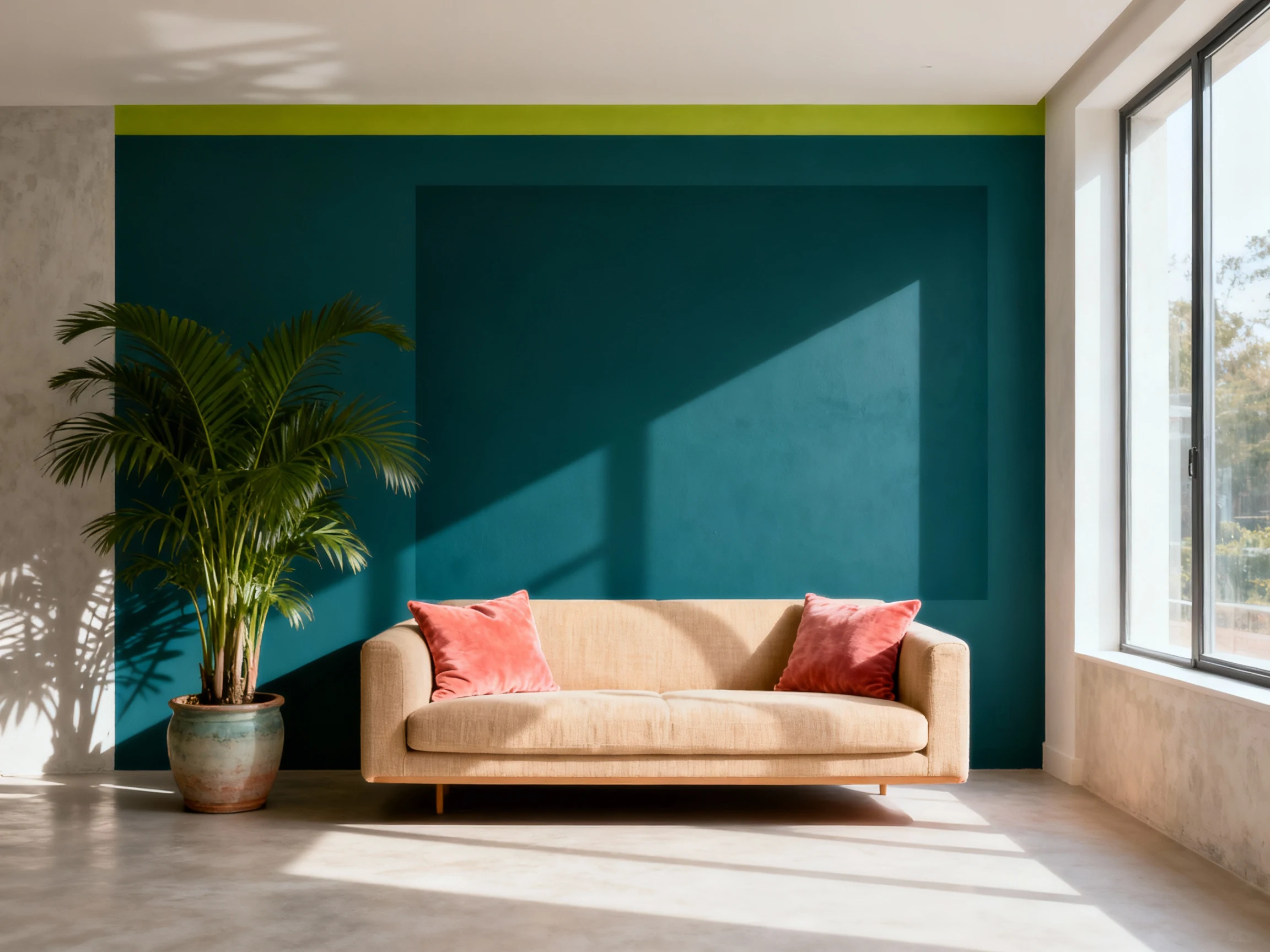 This one feels like a postcard from a beach boutique hotel. We’re talking a bold teal feature rectangle behind the sofa, a skinny chartreuse stripe along the ceiling line, and juicy coral accents that pop.