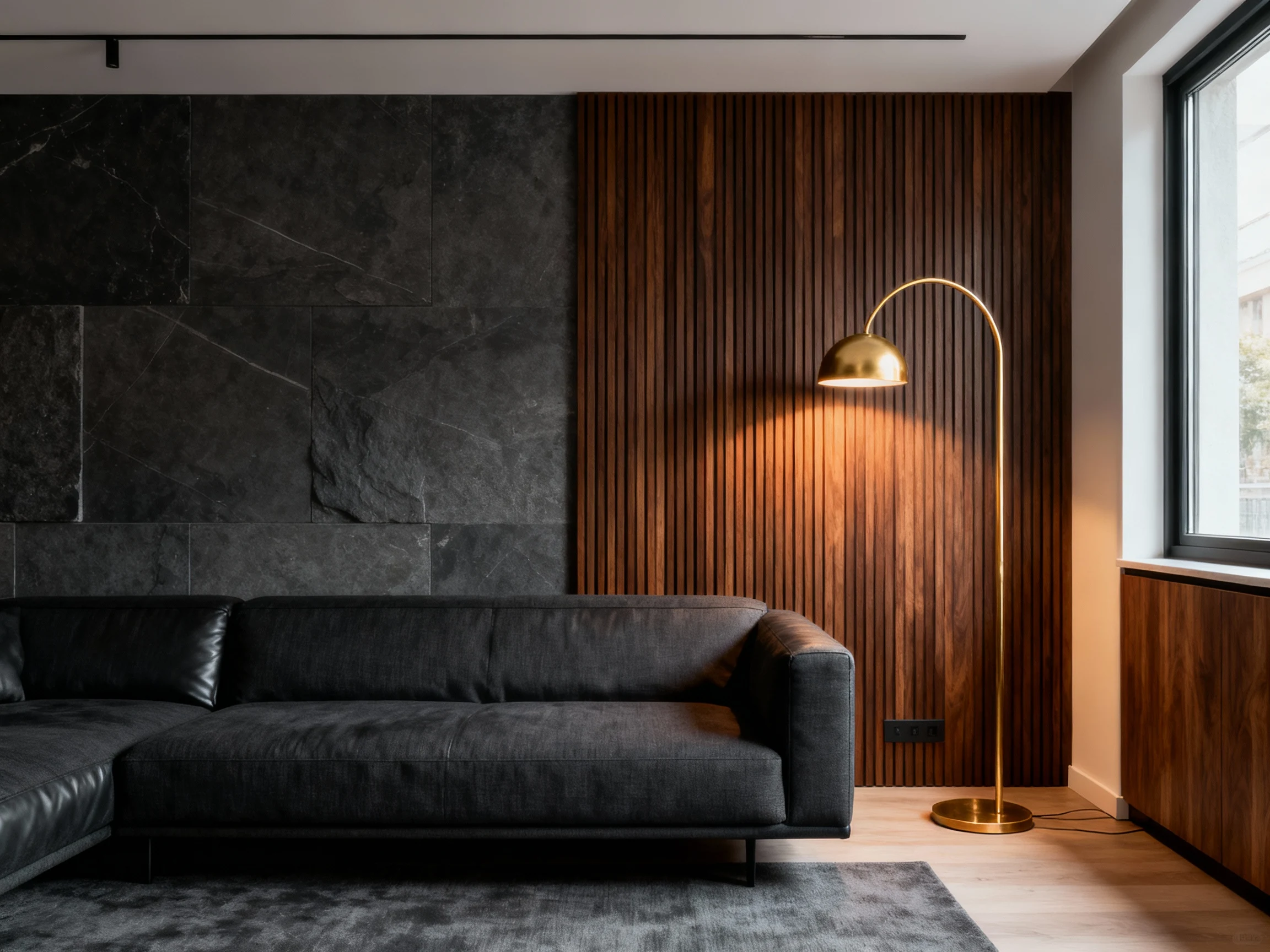Go modern and immersive with a **black feature wall** and **slatted walnut paneling** behind your TV. A **floating matte-black media console** hides clutter, while **LED backlighting** sets the mood.