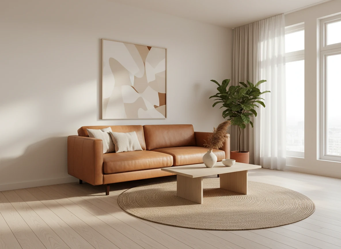 Think soft white walls paired with pale ash wood floors. Add a caramel leather sofa and a woven jute rug to make the space warm but clean. Minimal artwork—just one large abstract print—keeps the calm intact.