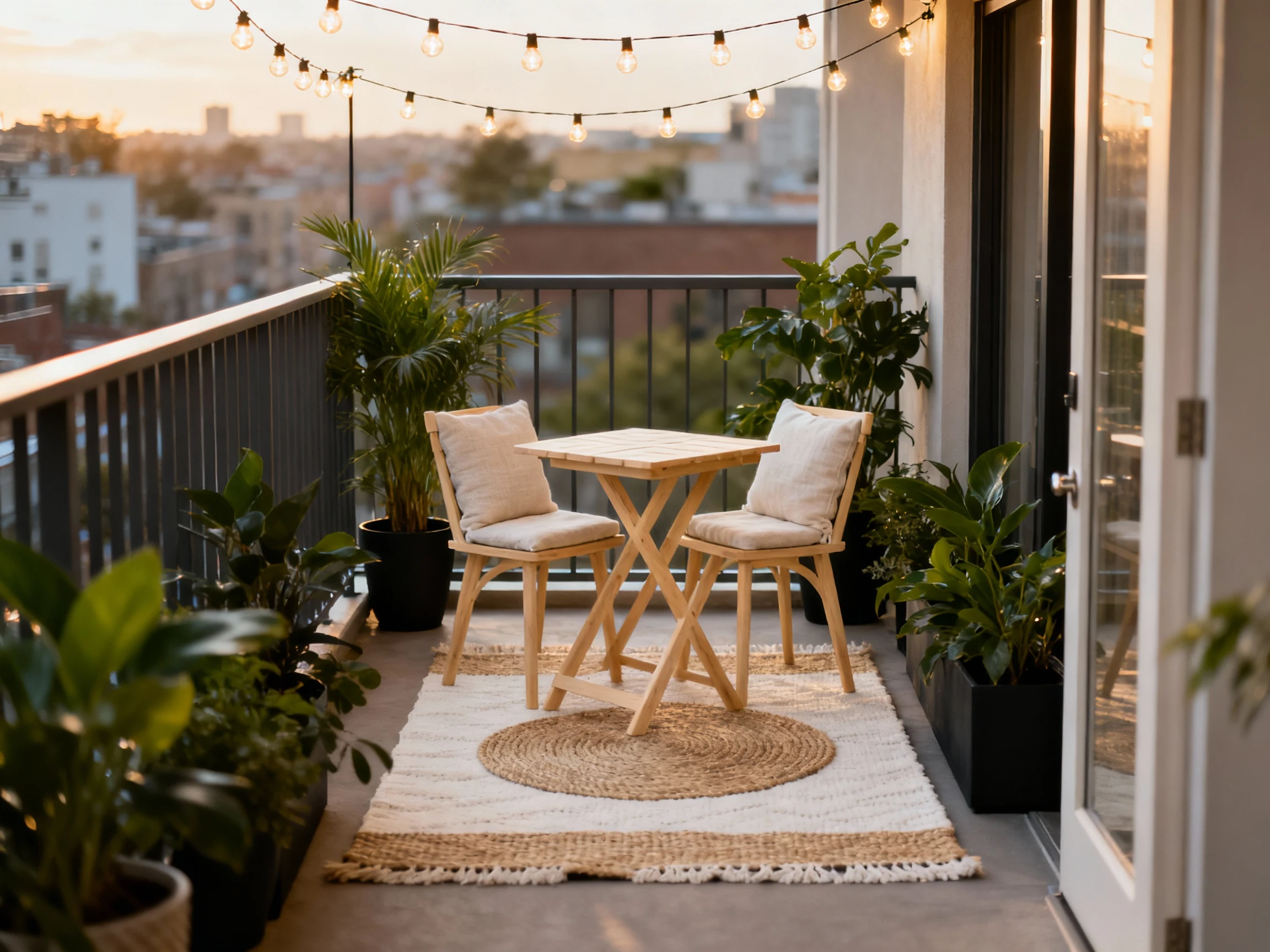Choose a **drop-leaf balcony table** that folds flat and slim **café chairs** that hang on hooks. Dress the table with **stoneware plates**, **linen napkins**, and a **bud vase**.