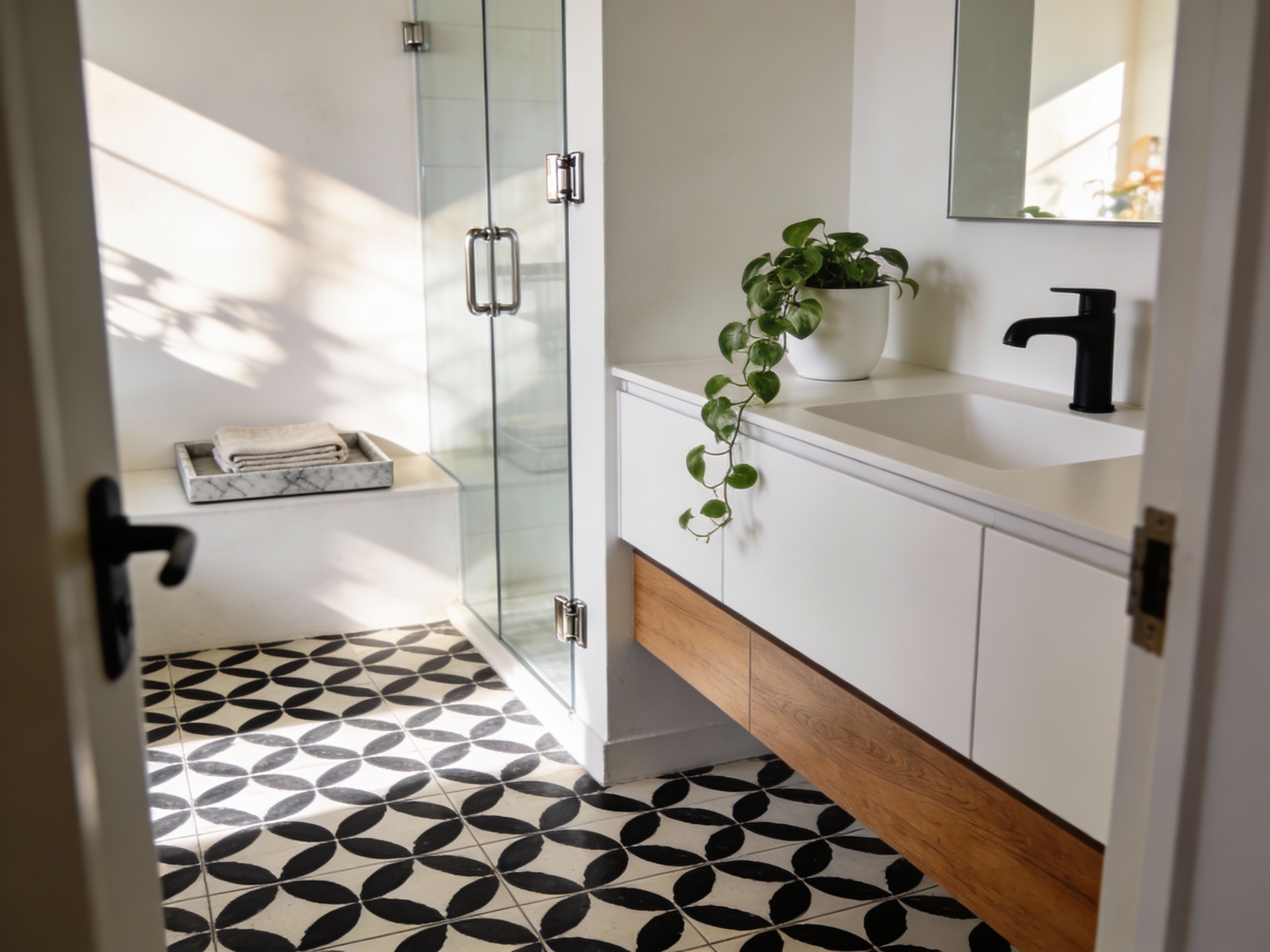 5) The Bold Contemporary Statement: Graphic Encaustic-Style Tile + Sleek Black Accents