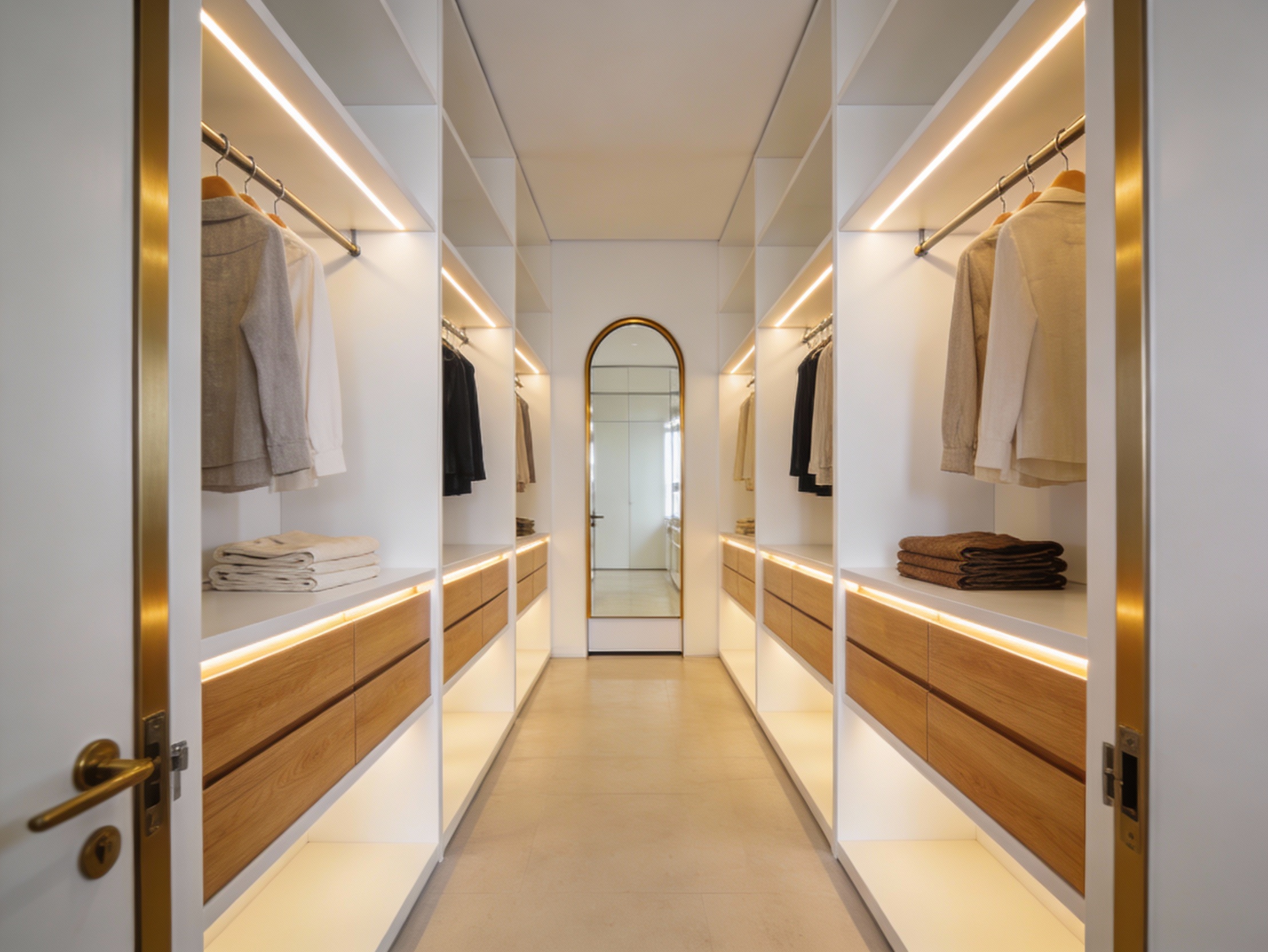 • Warm LED strip lights under shelves and above hanging rods for a soft glow.