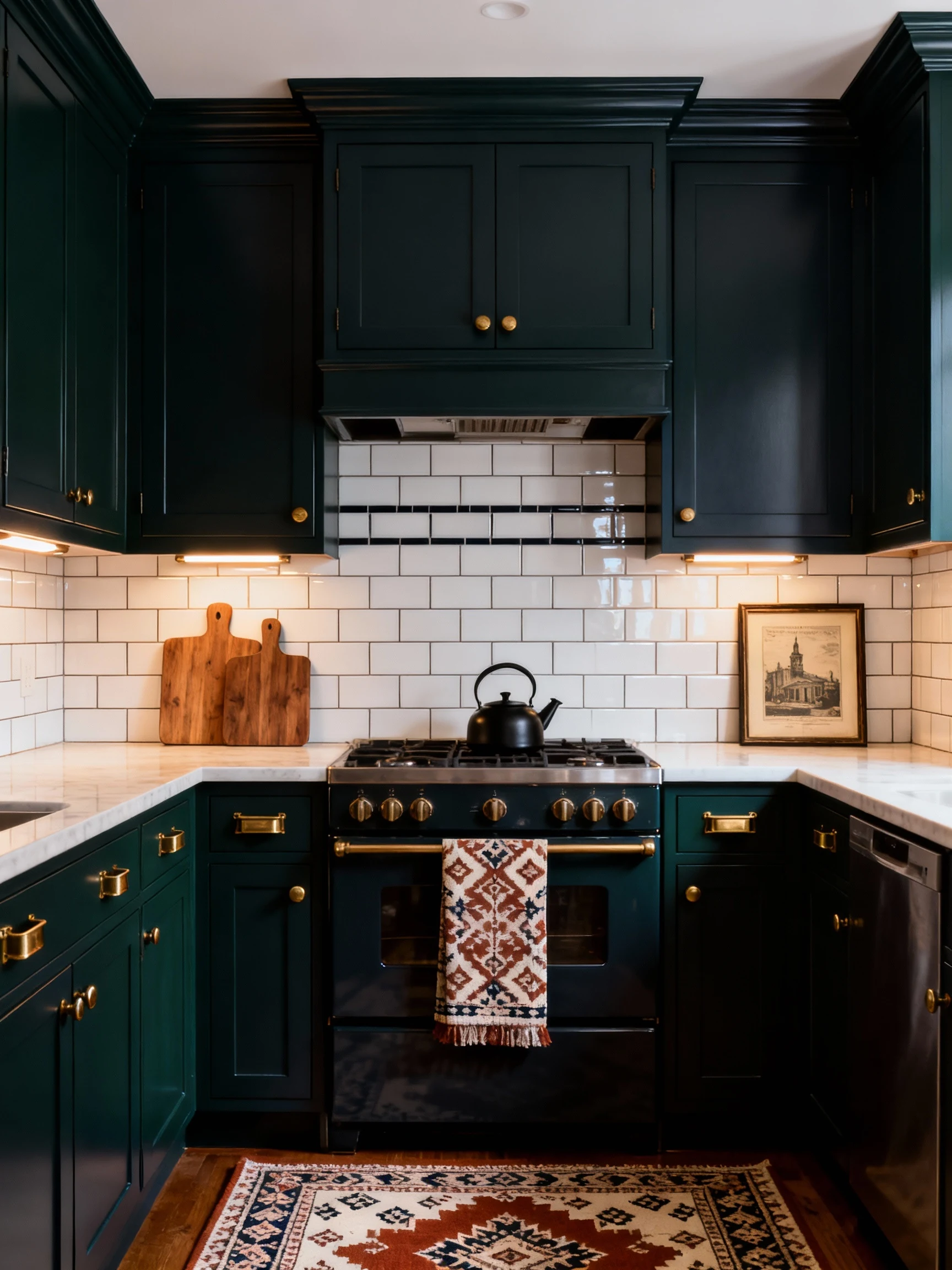 To keep it from getting heavy, you add contrast and shine. Think aged brass hardware, bright counters, and lighting that looks like it belongs in a vintage rowhouse.