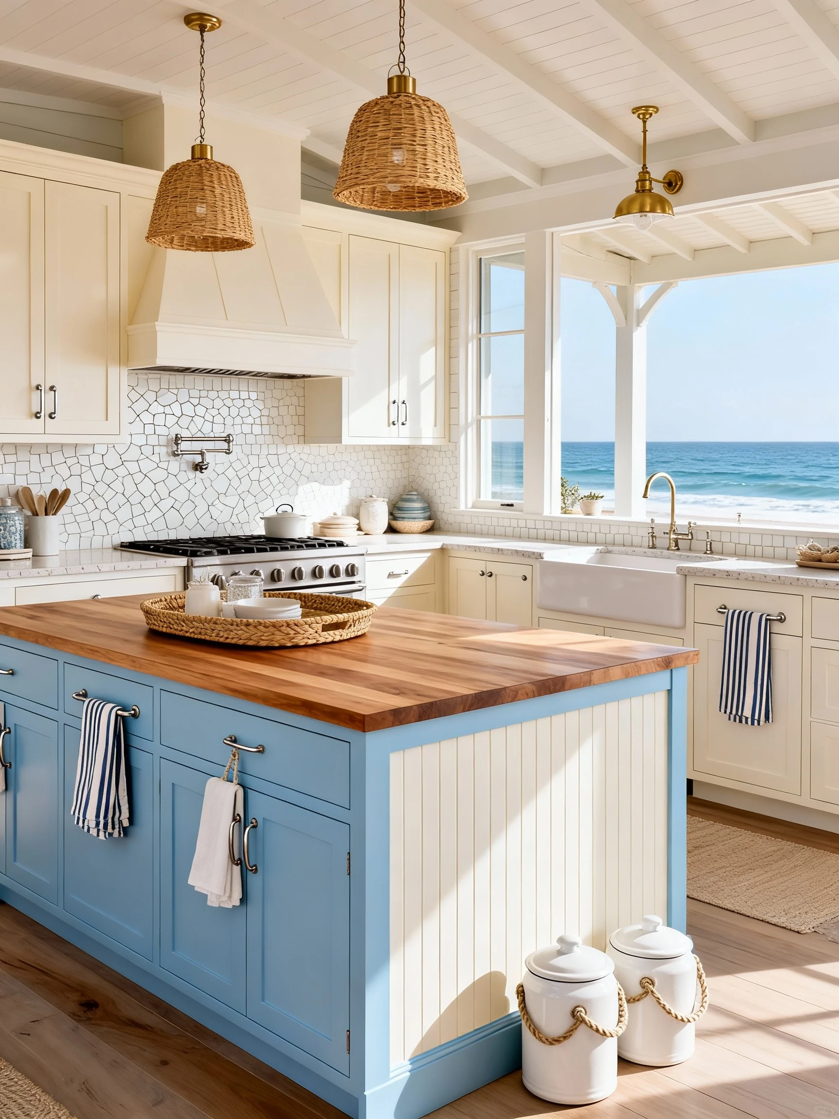 This is the kitchen that feels like you opened a window, even if it’s the middle of winter. It’s bright, airy, and just a little beachy without turning into a themed vacation rental.