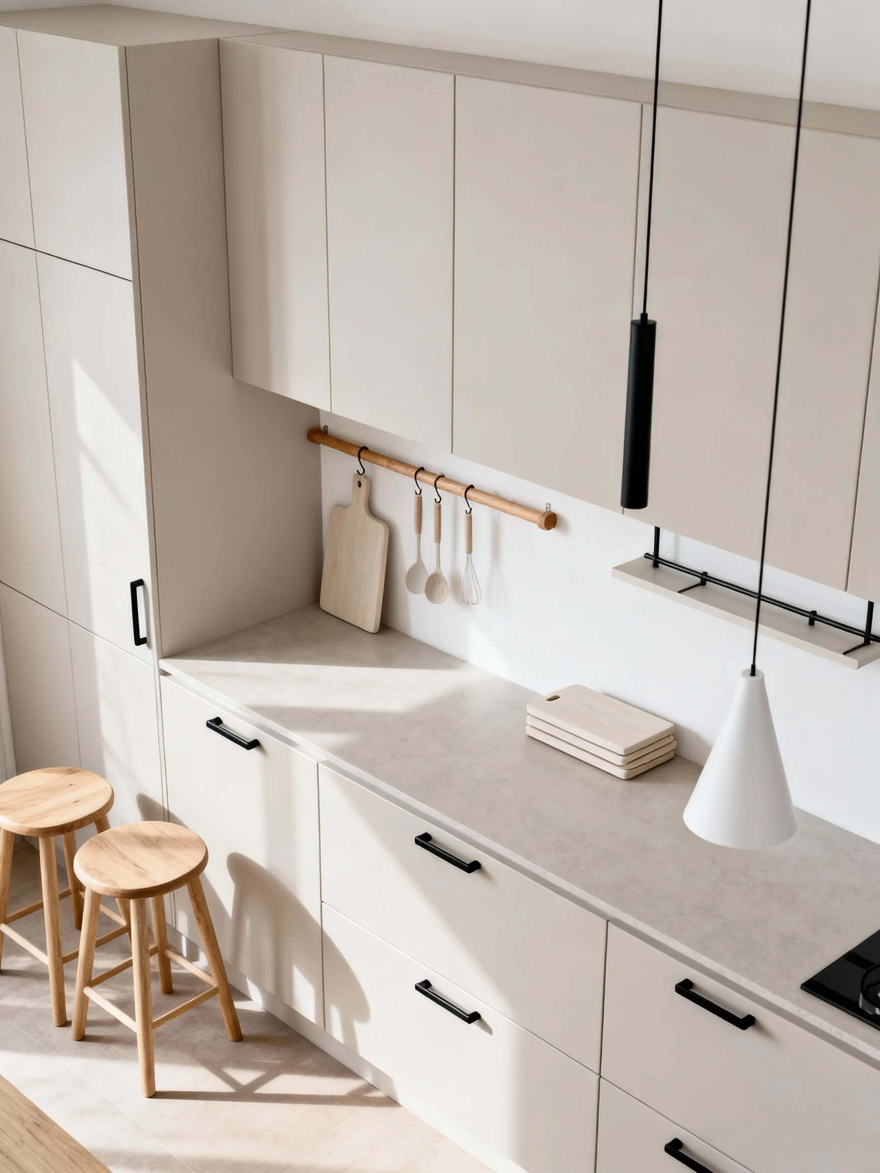A perfect weekend add-on is a rail system on the backsplash area for utensils and a small shelf. It keeps counters clear and adds that Scandinavian “everything has a home” feel.
