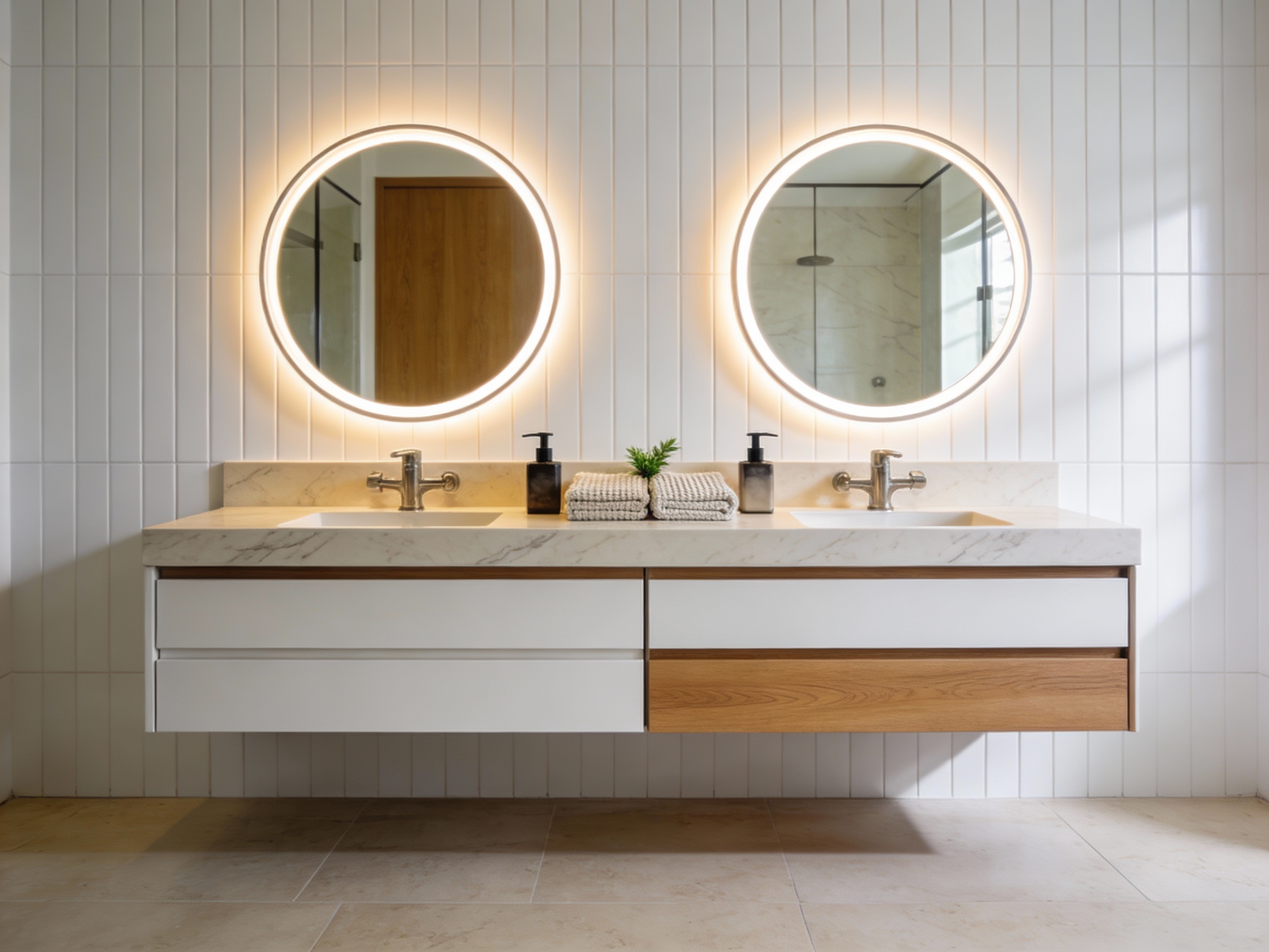 Now for the glow: two oversized backlit round mirrors feel modern and flattering. They also give you that “spa mirror” lighting that makes even a rushed morning feel calmer.