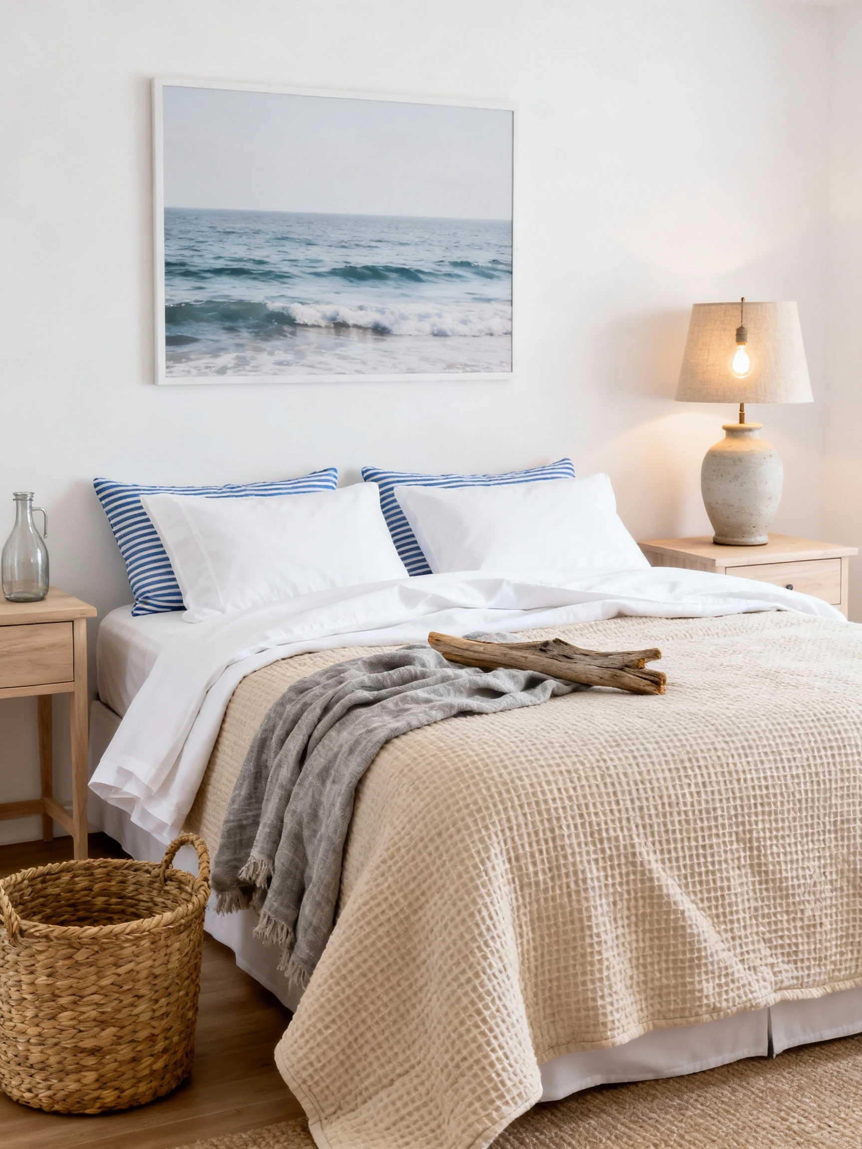 Now give the room that “coastal but not cheesy” vibe. Think pale oak tones, gentle texture, and a few sculptural touches that feel collected.